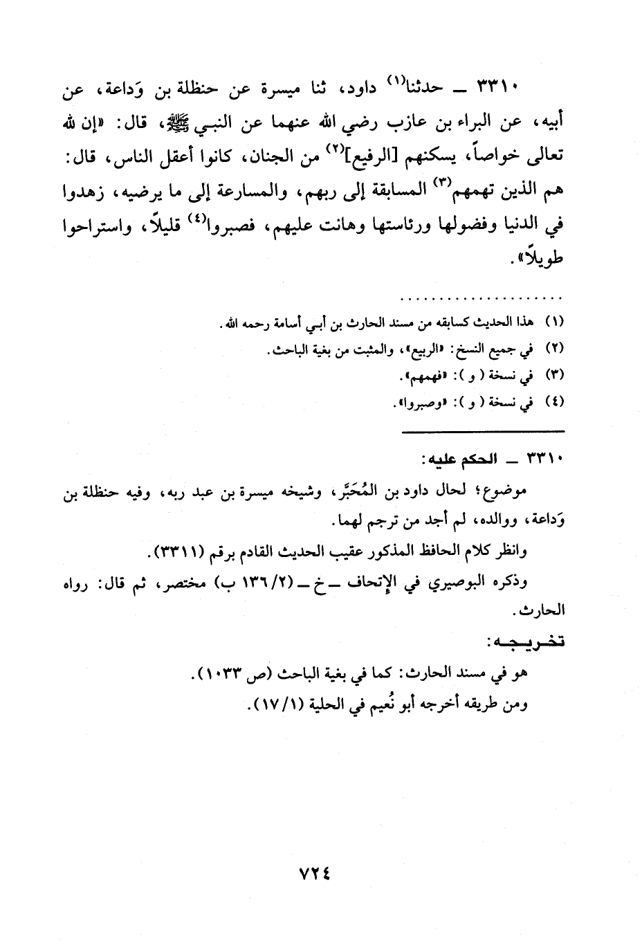 3310 - حَدَّثَنَا دَاوُدُ، ثنا مَيْسَرَةُ عَنْ حَنْظَلَةَ بْنِ وَدَاعَةَ، عَنْ أَبِيهِ، عَنِ الْبَرَاءِ بن عازب رَضِيَ الله عَنْهما عَنِ النَّبِيِّ صَلَّى اللَّهُ عَلَيْهِ وَسَلَّمَ، قَالَ: " §إن لله تعالى خَوَاصًّا، يُسْكِنُهُمُ [الرَّفِيعَ] مِنَ الْجِنَانِ، كَانُوا أَعْقَلَ النَّاسِ، قَالَ: هم الذين تهمهم الْمُسَابَقَةُ إِلَى رَبِّهِمْ، وَالْمُسَارَعَةُ إِلَى مَا يُرْضِيهِ، زَهِدُوا فِي الدُّنْيَا وَفُضُولِهَا وَرِئَاسَتِهَا وَهَانَتْ عَلَيْهِمْ، فَصَبَرُوا قَلِيلًا، وَاسْتَرَاحُوا طَوِيلًا ".