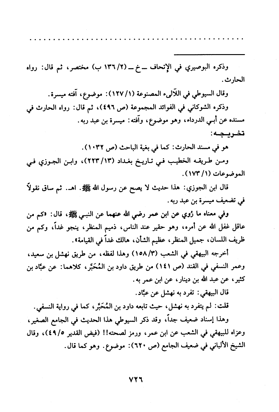 وذكره الشوكاني في الفوائد المجموعة (ص 496)، ثم قال: رواه الحارث في مسنده عن أبي الدرداء، وهو موضوع، وآفته: ميسرة بن عبد ربه.