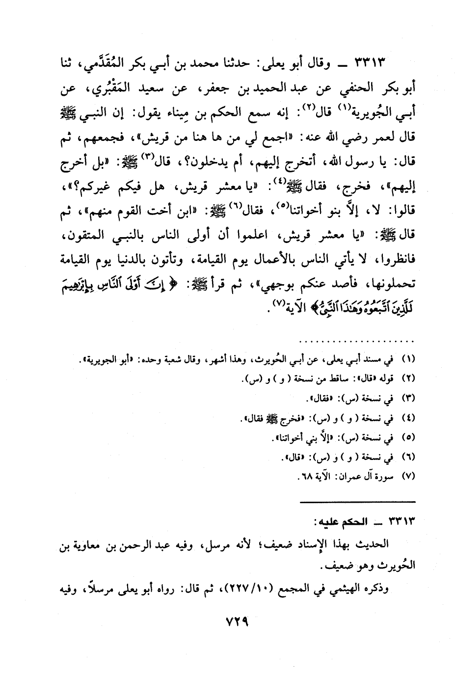3313 - وقال أَبُو يَعْلَى: حدثنا مُحَمَّدُ بْنُ أَبِي بَكْرٍ الْمُقَدَّمِيُّ، ثنا أَبُو بَكْرٍ الْحَنَفِيُّ عَنْ عَبْدِ الْحَمِيدِ بْنِ جَعْفَرٍ، عَنْ سَعِيدٍ المَقْبُري، عن أبي الجُويرية قال: أَنَّهُ سَمِعَ الحكم بن مِيناء يقول: أَنَّ النَّبِيَّ صَلَّى اللَّهُ عَلَيْهِ وَسَلَّمَ قَالَ لِعُمَرَ رَضِيَ الله عَنْه: " اجْمَعْ لي من ها هنا مَنْ قُرَيْشٍ "، فَجَمَعَهُمْ، ثُمَّ قَالَ: يَا رَسُولَ اللَّهِ، أَتَخْرُجُ إِلَيْهِمْ، أَمْ يَدْخُلُونَ؟ ، قَالَ صَلَّى اللَّهُ عَلَيْهِ وَسَلَّمَ: " بَلْ أَخْرُجُ إِلَيْهِمْ "، فَخَرَجَ، فَقَالَ صَلَّى اللَّهُ عَلَيْهِ وَسَلَّمَ: " يَا مَعْشَرَ قُرَيْشٍ، هَلْ فِيكُمْ غيركم؟ "، قالوا: لا، إِلَّا بنو أخواتنا، فقال صَلَّى اللَّهُ عَلَيْهِ وَسَلَّمَ: " ابْنُ أُخْتِ الْقَوْمِ مِنْهُمْ "، ثُمَّ قَالَ صَلَّى اللَّهُ عَلَيْهِ وَسَلَّمَ: " يَا مَعْشَرَ قُرَيْشٍ، اعْلَمُوا أَنَّ أَوْلَى النَّاسِ بِالنَّبِيِّ الْمُتَّقُونِ، فَانْظُرُوا، §لَا يَأْتِي النَّاسُ بِالْأَعْمَالِ يَوْمَ الْقِيَامَةِ، وَتَأْتُونَ بِالدُّنْيَا يَوْمَ الْقِيَامَةِ تَحْمِلُونَهَا، فَأَصُدَّ عَنْكُمْ بِوَجْهِي "، ثُمَّ قَرَأَ صَلَّى اللَّهُ عَلَيْهِ وَسَلَّمَ: {إِنَّ أَوْلَى النَّاسِ بِإِبْرَاهِيمَ لَلَّذِينَ اتَّبَعُوهُ وهذا النبي} الآية.