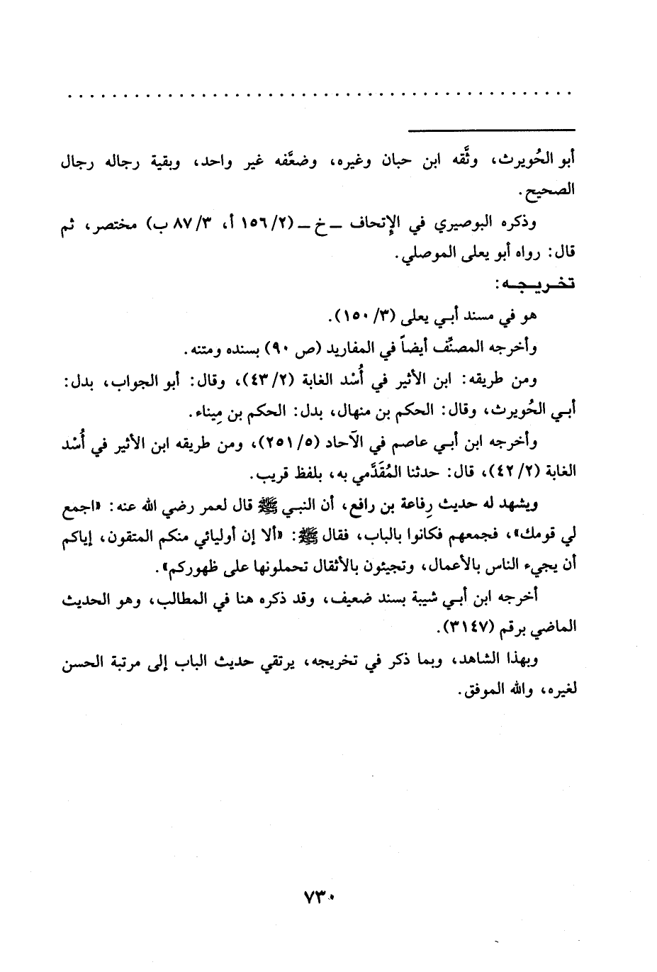 ويشهد له حديث رِفاعة بن رافع، أن النبي -صلى الله عليه وسلم- قال لعمر رضي الله عنه: "اجمع لي قومك"، فجمعهم فكانوا بالباب، فقال -صلى الله عليه وسلم-: "ألا إن أوليائي منكم المتقون، إياكم أن يجيء الناس بالأعمال، وتجيئون بالأثفال تحملونها على ظهوركم".