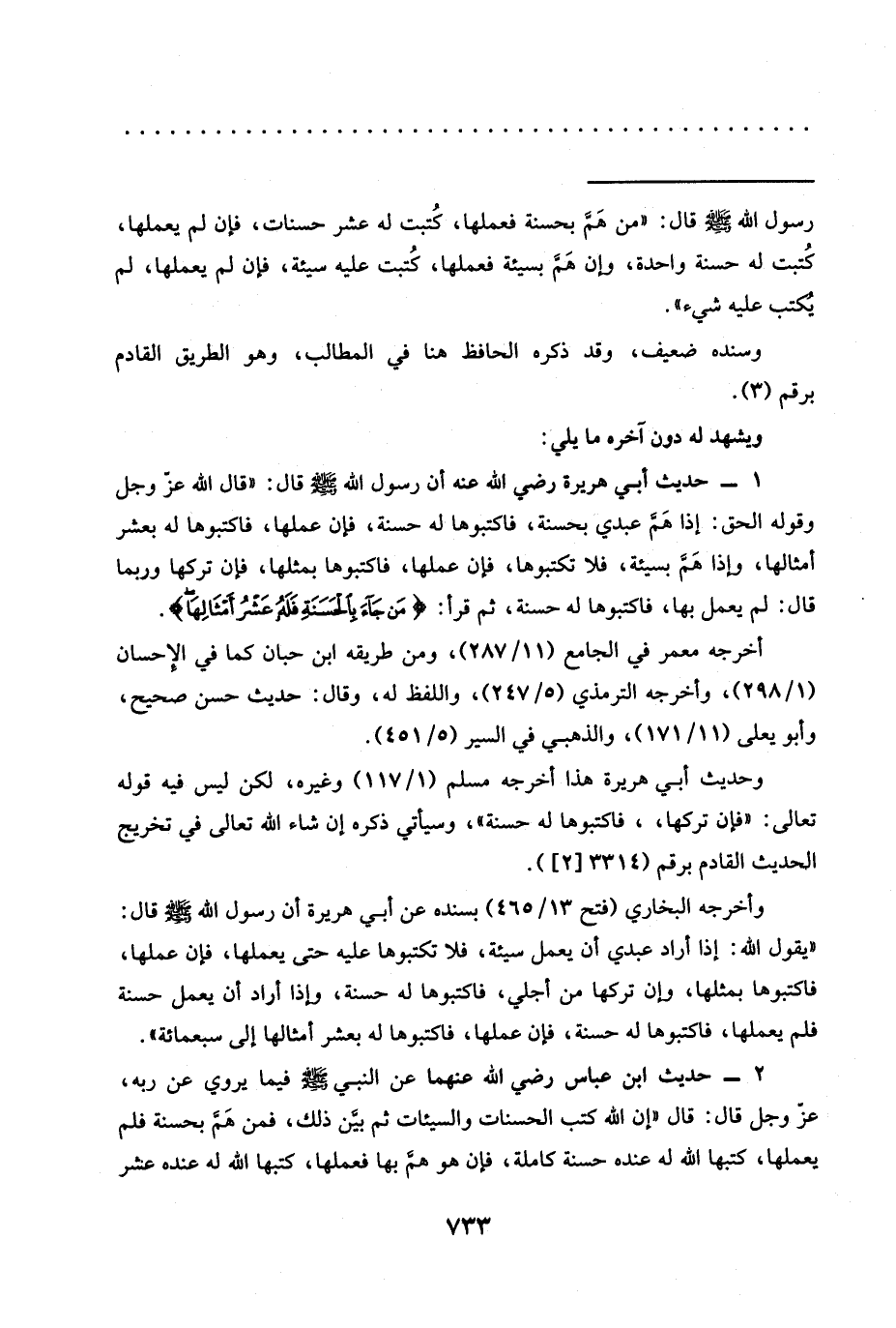 وأخرجه البخاريُّ (فتح 13/ 465) بسنده عَنْ أَبِي هُرَيْرَةَ أَنَّ رَسُولَ اللَّهِ -صَلَّى الله عليه وسلم- قال: "يقول الله: إذا أراد عبدي أن يعمل سيئة، فلا تكتبوها عليه حتى يعملها، فإن عملها، فاكتبوها بمثلها، وإن تركها من أجلي، فاكتبوها له حسنة، وإذا أراد أن يعمل حسنة فلم يعملها، فاكتبوها له حسنة، فإن عملها، فاكتبوها له بعشر أمثالها إلى سبعمائة".