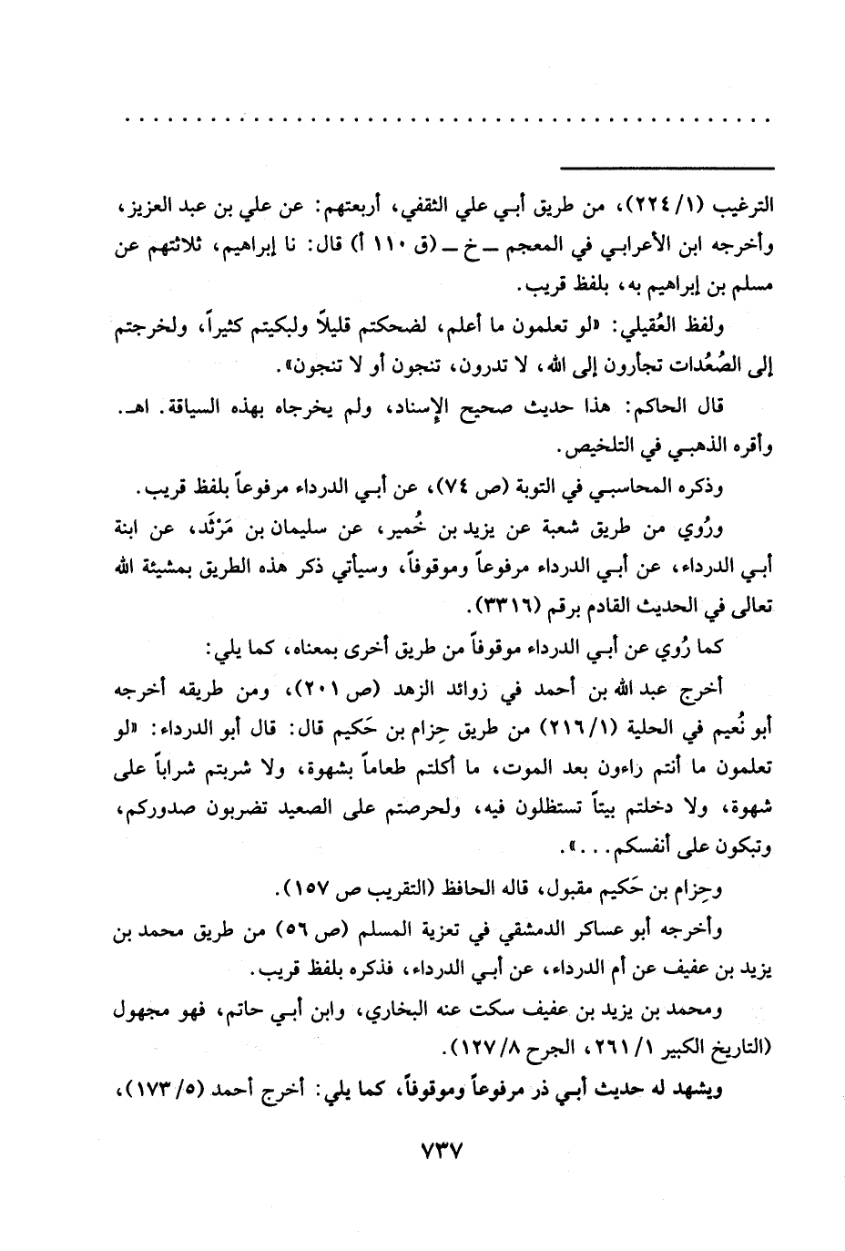 ولفظ العُقيلي: "لَوْ تَعْلَمُونَ مَا أَعْلَمُ، لَضَحِكْتُمْ قَلِيلًا وَلَبَكَيْتُمْ كثيرًا، ولخرجتم إلى الصُعُدات تجأرون إلى الله، لا تدرون، تنجون أو لا تنجون".