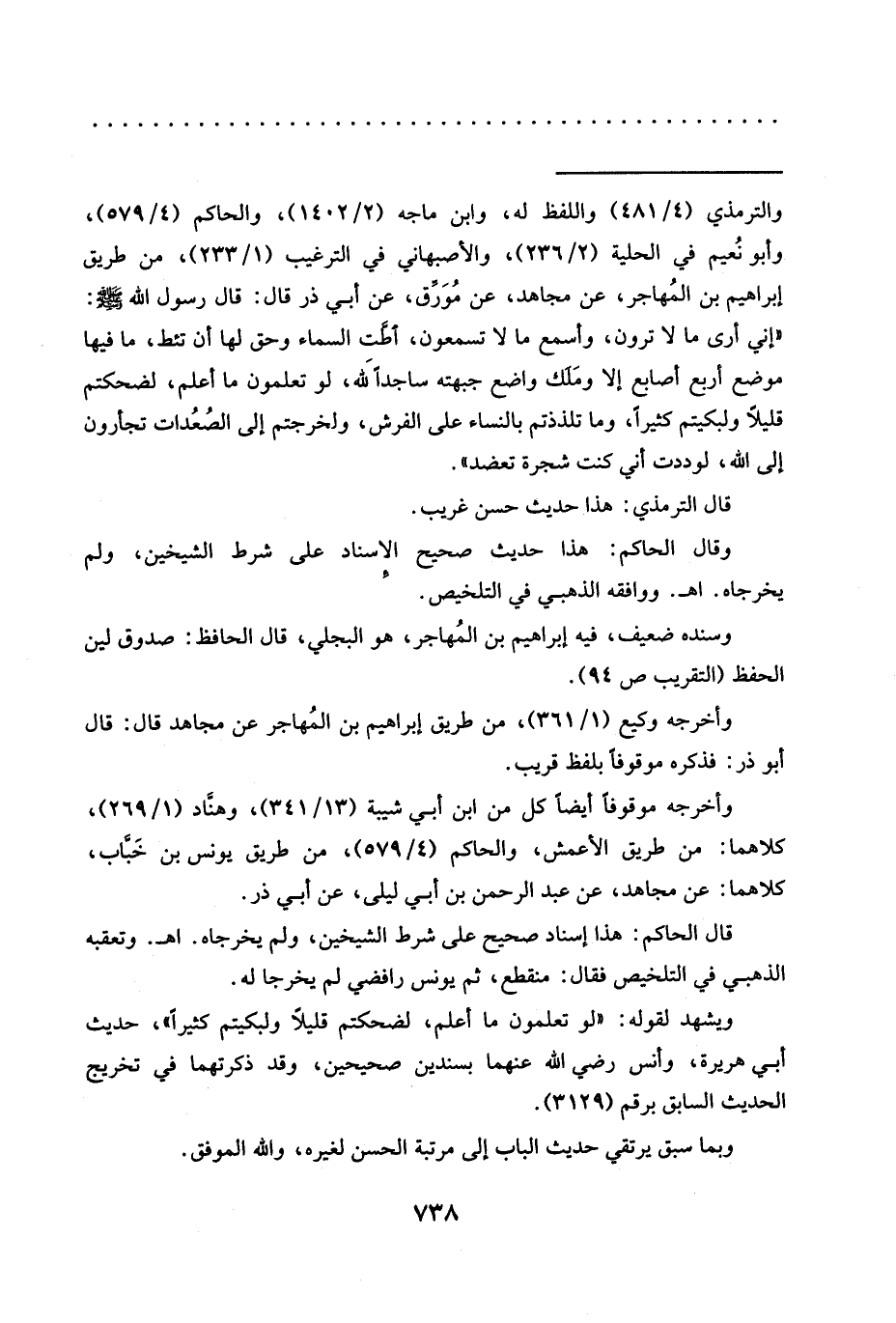 = والترمذي (4/ 481) واللفظ له، وابن ماجه (2/ 1402)، والحاكم (4/ 579)، وأبو نُعيم في الحلية (2/ 236)، والأصبهاني في الترغيب (1/ 233)، من طريق إبراهيم بن المُهاجر، عن مجاهد، عن مُوَرِّق، عَنْ أَبِي ذَرٍّ قَالَ: قَالَ رَسُولُ اللَّهِ -صَلَّى اللَّهُ عَلَيْهِ وسلم-: "إني أرى ما لا ترون، وأسمع ما لا تسمعون، أطَّت السماء وحق لها أن تئط، ما فيها موضع أربع أصابع إلا ومَلك واضع جبهته ساجدًا لله، لَوْ تَعْلَمُونَ مَا أَعْلَمُ، لَضَحِكْتُمْ قَلِيلًا وَلَبَكَيْتُمْ كثيرًا، وما تلذذتم بالنساء على الفرش، ولخرجتم إلى الصُعُدات تجأرون إلى الله، لوددت أني كنت شجرة تعضد".