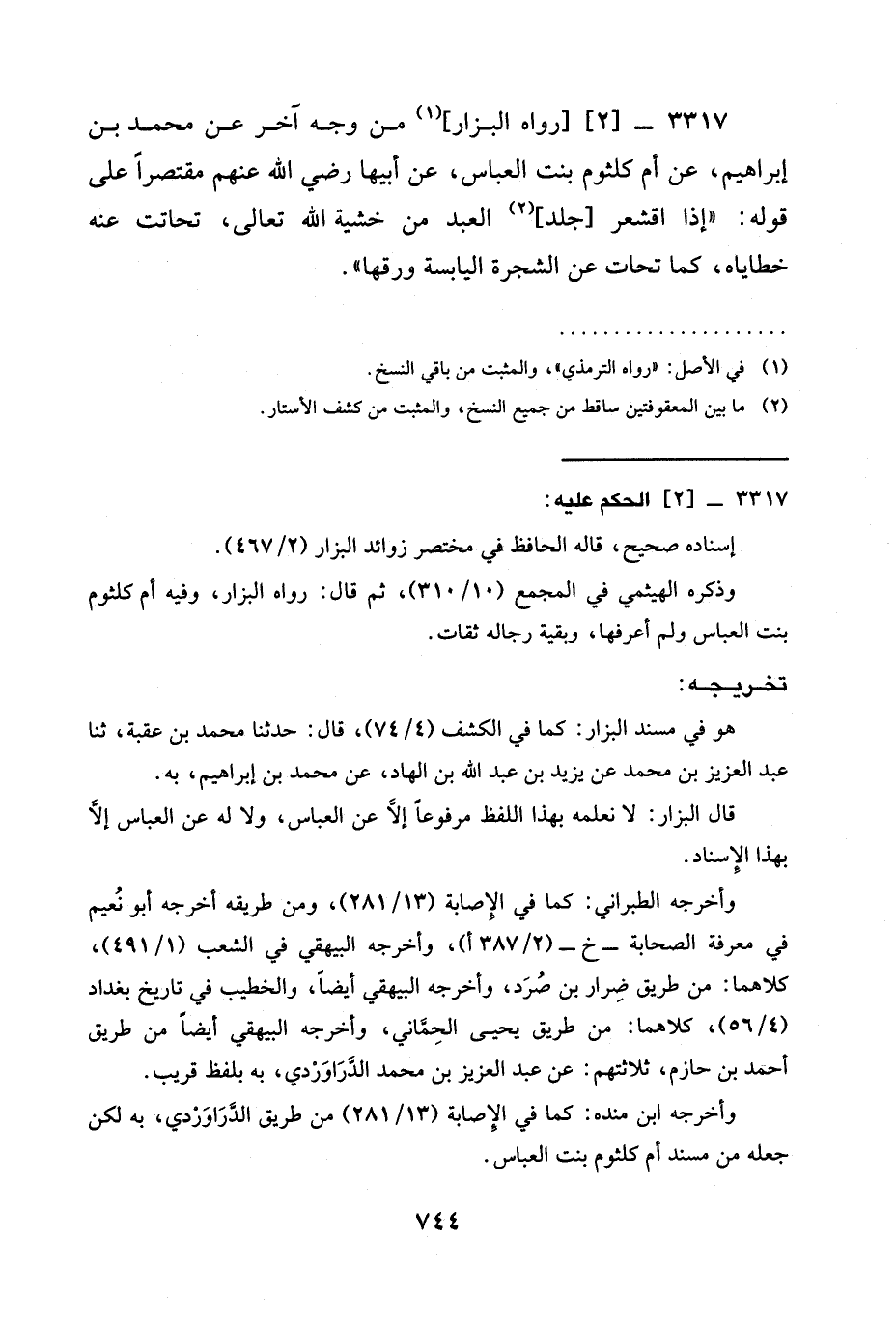 3317 - [2] [رواه الْبَزَّارُ] (¬1) مِنْ وَجْهٍ آخَرَ عَنْ محمَّد بْنِ إبراهيم، عن أم كلثوم بنت العباس، عن أبيها رضي الله عنهم مقتصرًا على قوله: "إذا اقشعر [جلد] (¬2) العبد من خشية الله تعالى، تحاتت عنه خطاياه، كما تحات عن الشجرة اليابسة ورقها".