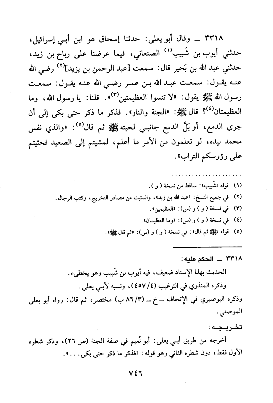 3318 - وَقَالَ أَبُو يَعْلَى: حدثنا إِسْحَاقُ هُوَ ابْنُ أَبِي إِسْرَائِيلَ، حَدَّثَنِي أَيُّوبُ بن شَبيب الصنعاني، فيما عرضنا على رَبَاحِ بْنِ زَيْدٍ، حَدَّثَنِي عَبْدُ اللَّهِ بن بحير قال: سمعت [عبد الرحمن بن يزيد] رَضِيَ الله عَنْه يقول: سَمِعْتُ عَبْدَ اللَّهِ بْنَ عمر رَضِيَ الله عَنْه يقول: سَمِعْتُ رَسُولَ اللَّهِ صَلَّى اللَّهُ عَلَيْهِ وَسَلَّمَ يَقُولُ: " §لَا تَنْسَوَا العظيمتين ". قلنا: يا رَسُولُ الله، وما العظيمتان؟ قَالَ صَلَّى اللَّهُ عَلَيْهِ وَسَلَّمَ: " الْجَنَّةُ وَالنَّارُ ". فَذَكَرَ مَا ذكر حتى بكى إلى أن جرى الدمع، أَوْ بَلَّ الدَّمْعُ جَانِبَيْ لِحْيَتِهِ صَلَّى اللَّهُ عَلَيْهِ وَسَلَّمَ ثُمَّ قَالَ: " وَالَّذِي نَفْسُ مُحَمَّدٍ بِيَدِهِ، لَوْ تَعْلَمُونَ مِنَ الْأَمْرِ مَا أَعْلَمُ، لَمَشَيْتُمْ إِلَى الصَّعِيدِ فَحَثَيْتُمْ عَلَى رؤوسكم التُّرَابَ ".