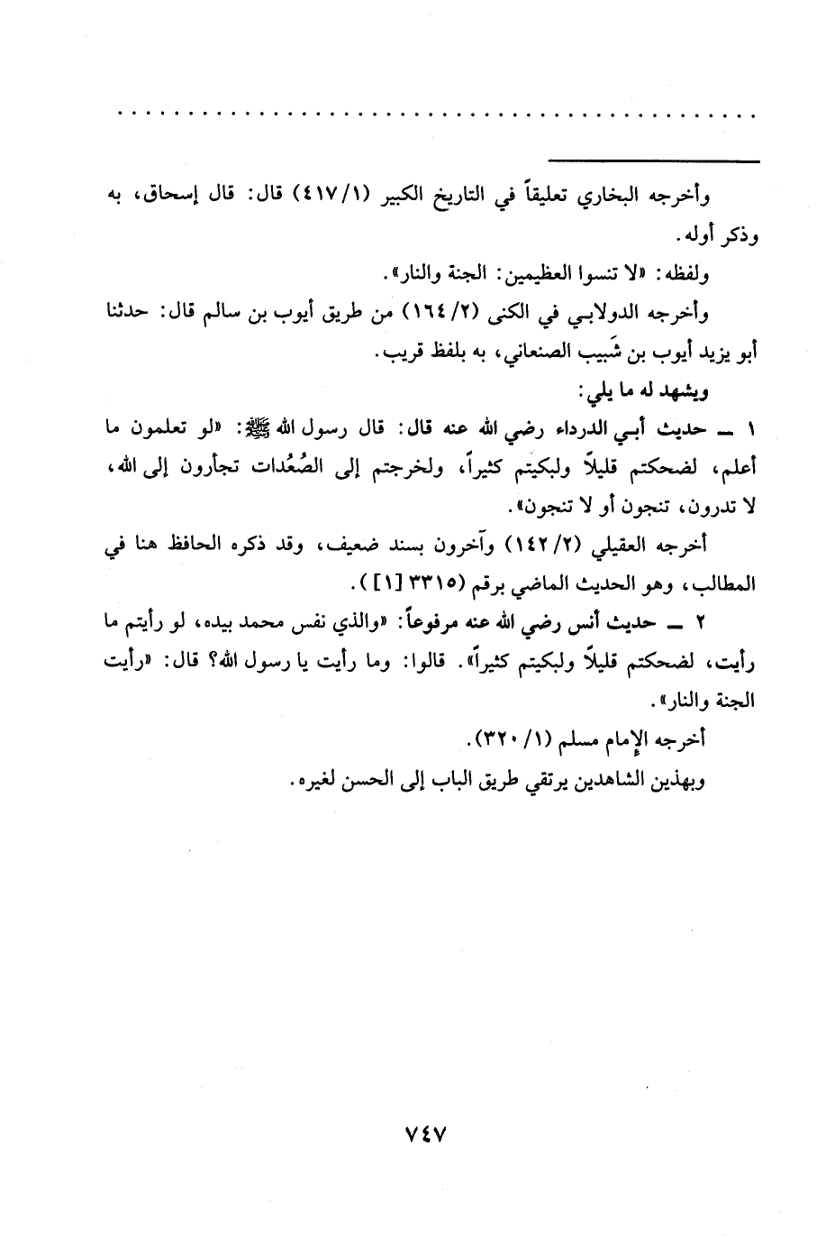 2 - حديث أنس رضي الله عنه مرفوعًا: "والذي نفس محمَّد بيده، لو رأيتم ما رأيت، لضحكتم قليلًا ولبكيتم كثيرًا". قالوا: وما رأيت يا رسول الله؟ قال: "رأيت الجنة والنار".