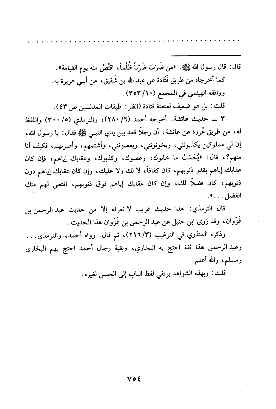 3 - حديث عائشة: أخرجه أحمد (6/ 280)، والترمذي (5/ 300) واللفظ له، من طريق عُروة عن عائشة، أن رجلًا قعد بين يدي النبي -صلى الله عليه وسلم- فقال: يا رسول الله، إن لي مملوكين يكذبونني، ويخونونني، ويعصونني، وأشتمهم، وأضربهم، فكيف أنا منهم؟، قال: "يُحسَبُ ما خانوك، وعصوك، وكذبوك، وعقابك إياهم، فإن كان عقابك إياهم بقدر ذنوبهم، كان كفافًا، لا لك ولا عليك، وإن كان عقابك إياهم دون ذنوبهم، كان فضلًا لك، وإن كان عقابك إياهم فوق ذنوبهم، اقتص لهم منك الفضل ... ".