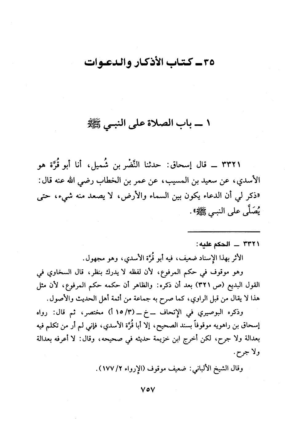 3321 - قال إسحاق: حدثنا النَّضْرُ بْنُ شُمَيْلٍ، أنا أَبُو قُرَّةَ هُوَ الْأَسَدِيُّ، عَنْ سَعِيدِ بْنِ الْمُسَيِّبِ، عَنْ عُمَرَ بْنِ الْخَطَّابِ رَضِيَ الله عَنْه قَالَ: " ذُكِرَ لِي أَنَّ §الدُّعَاءَ يَكُونُ بَيْنَ السَّمَاءِ وَالْأَرْضِ، لَا يَصْعَدُ مِنْهُ شَيْءٌ، حَتَّى يُصَلَّى عَلَى النَّبِيِّ صَلَّى اللَّهُ عَلَيْهِ وَسَلَّمَ ".