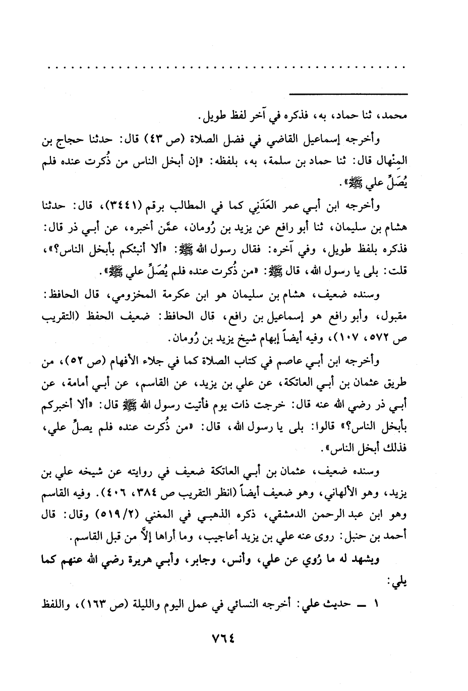 وأخرجه ابن أبي عاصم في كتاب الصلاة كما في جلاء الأفهام (ص 52)، من طريق عثمان بن أبي العاتكة، عَنْ عَلِيِّ بْنِ يَزِيدَ، عَنِ الْقَاسِمِ، عَنْ أبي أمامة، عَنْ أَبِي ذَرٍّ رَضِيَ اللَّهُ عَنْهُ قَالَ: خرجت ذات يوم فَأَتَيْتُ رَسُولَ اللَّهِ -صَلَّى اللَّهُ عَلَيْهِ وَسَلَّمَ- قال: "ألا أخبركم بأبخل الناس؟ " قَالُوا: بَلَى يَا رَسُولَ اللَّهِ، قَالَ: "مَنْ ذُكرت عنده فلم يصلِّ علي، فذلك أبخل الناس".