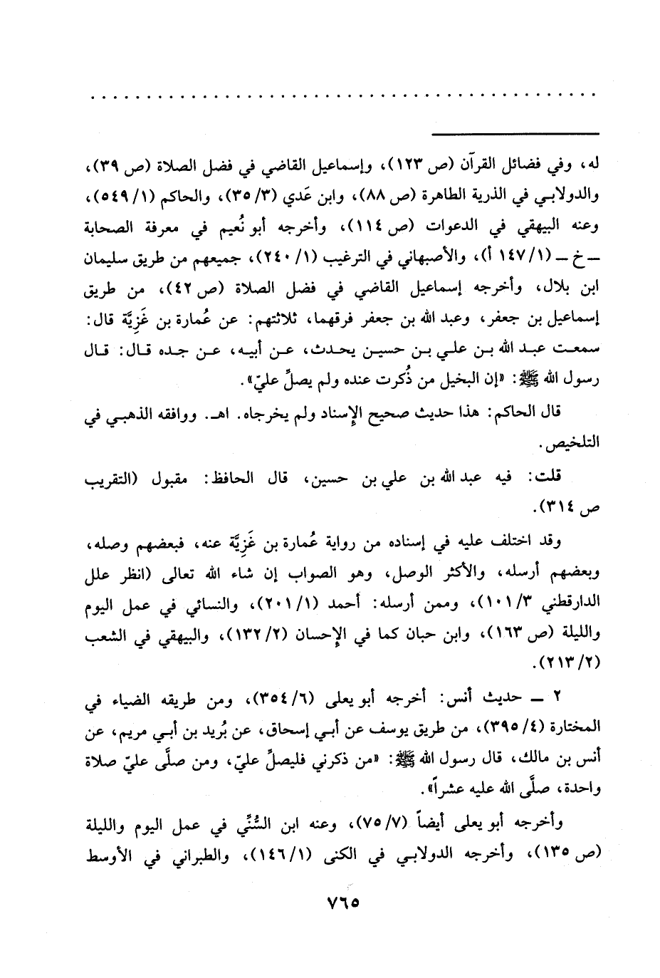 = له، وفي فضائل القرآن (ص 123)، وإسماعيل القاضي في فضل الصلاة (ص 39)، والدولابي في الذرية الطاهرة (ص 88)، وابن عَدي (3/ 35)، والحاكم (1/ 549)، وعنه البيهقي في الدعوات (ص 114)، وأخرجه أبو نُعيم في معرفة الصحابة -خ- (1/ 147 أ)، والأصبهاني في الترغيب (1/ 240)، جميعهم من طريق سليمان ابن بلال، وأخرجه إسماعيل القاضي في فضل الصلاة (ص 42)، من طريق إسماعيل بن جعفر، وعبد الله بن جعفر فرقهما، ثلاثتهم: عن عُمارة بن غَزِيَّة قال: سمعت عبد الله بن علي بن حسين يحدث، عَنْ أَبِيهِ، عَنْ جَدِّهِ قَالَ: قَالَ رَسُولُ الله -صلى الله عليه وسلم-: "إن البخيل من ذُكرت عنده ولم يصلِّ عليّ".