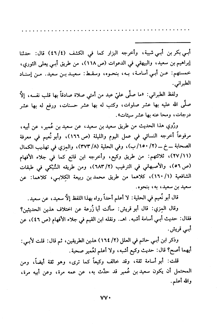 ورُوي هذا الحديث من طريق سعيد بن سعيد، عن سعيد بن عُمير، عن أبيه، مرفوعًا أخرجه النسائيُّ في عمل اليوم والليلة (ص 166)، وأبو نُعيم في معرفة الصحابة -خ- (2/ 150/ ب)، وفي الحلية (8/ 373)، والمِزي في تهذيب الكمال (11/ 27)، ثلاثتهم: من طريق وكيع، وأخرجه ابن قانع كما في جلاء الأفهام (ص 56)، والأصبهاني في التركيب (2/ 683)، ومن طريقه السُّبْكي في طبقات الشافعية (1/ 160)، كلاهما من طريق محمد بن ربيعة الكِلابي، كلاهما: عن سعيد بن سعيد، به، بنحوه.