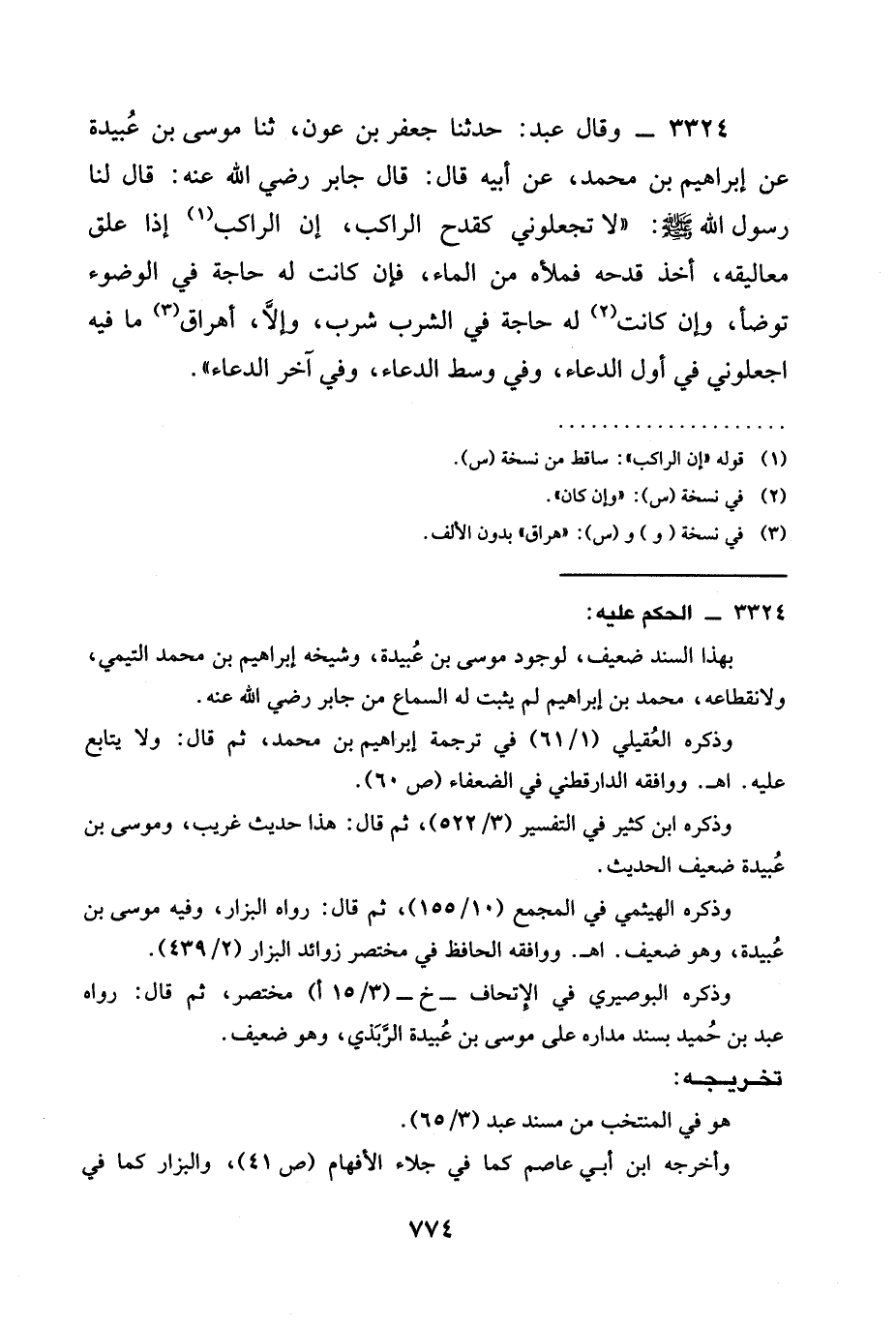 3324 - وَقَالَ عَبْدُ: حدثنا جَعْفَرُ بْنُ عَوْنٍ، ثنا مُوسَى بْنُ عُبَيْدَةَ عَنْ إِبْرَاهِيمَ بْنِ مُحَمَّدٍ، عَنْ أَبِيهِ قَالَ: قَالَ جَابِرٌ رَضِيَ الله عَنْه: قَالَ لَنَا رَسُولُ اللَّهِ صَلَّى اللَّهُ عَلَيْهِ وَسَلَّمَ: " §لَا تَجْعَلُونِي كَقِدْحِ الرَّاكِبِ، إِنَّ الرَّاكِبَ إِذَا عَلَّقَ مَعَالِيقَهُ، أَخَذَ قِدْحَهُ فَمَلَأَهُ مِنَ الْمَاءِ، فَإِنْ كَانَتْ لَهُ حَاجَةٌ فِي الْوُضُوءِ تَوَضَّأَ، وَإِنْ كَانَتْ لَهُ حَاجَةٌ فِي الشُّرْبِ شَرِبَ، وَإِلَّا، أَهْرَاقَ مَا فِيهِ اجْعَلُونِي فِي أَوَّلِ الدُّعَاءِ، وَفِي وَسَطِ الدُّعَاءِ، وَفِي آخِرِ الدُّعَاءِ ".