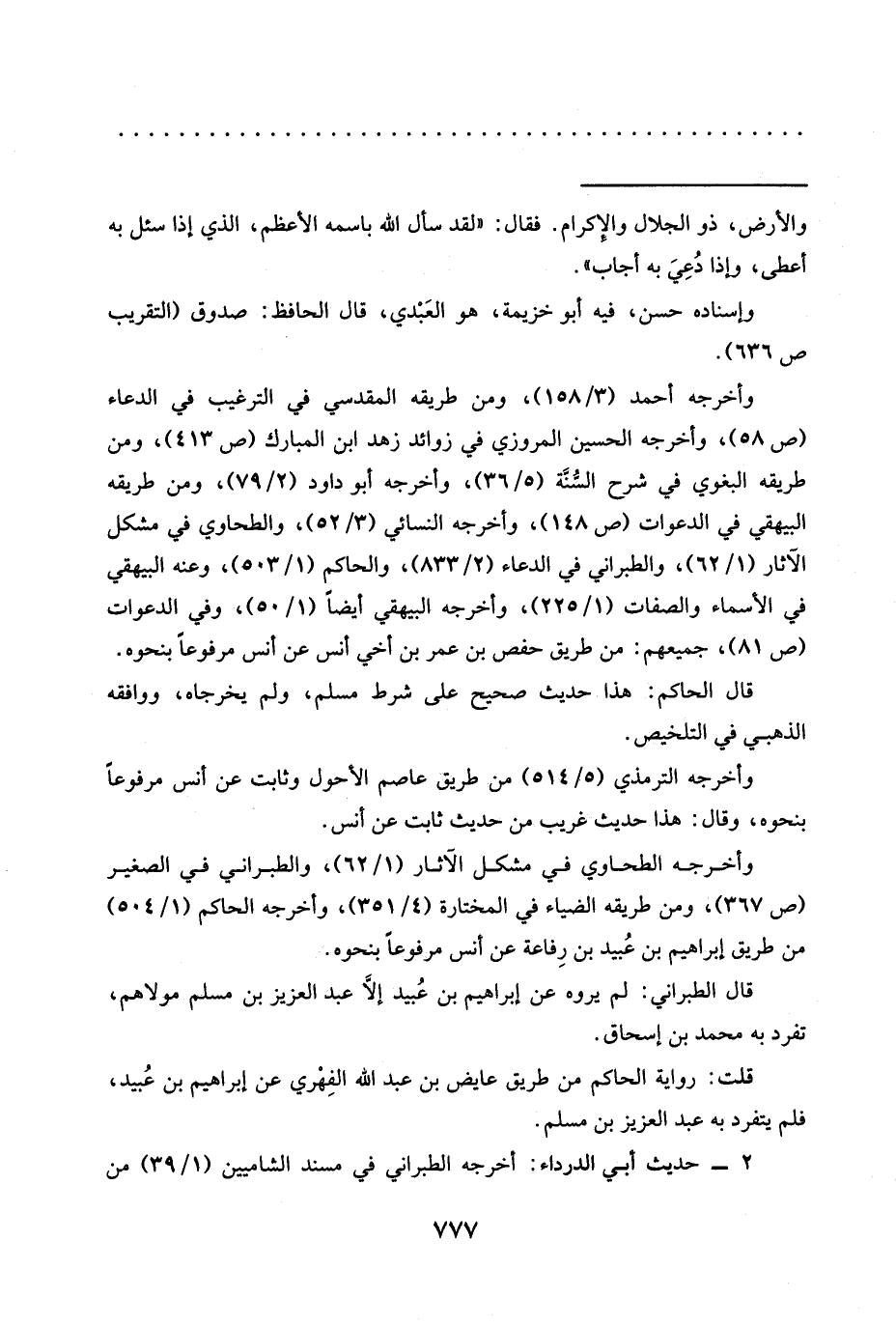 وأخرجه أحمد (3/ 158)، ومن طريقه المقدسي في الترغيب في الدعاء (ص 58)، وأخرجه الحسين المروزي في زوائد زهد ابن المبارك (ص 413)، ومن طريقه البغوي في شرح السُّنَّة (5/ 36)، وأخرجه أبو داود (2/ 79)، ومن طريقه البيهقي في الدعوات (ص 148)، وأخرجه النسائيُّ (3/ 52)، والطحاوي في مشكل الآثار (1/ 62)، والطبراني في الدعاء (2/ 833)، والحاكم (1/ 503)، وعنه البيهقي في الأسماء والصفات (1/ 225)، وأخرجه البيهقي أيضًا (1/ 50)، وفي الدعوات (ص81)، جميعهم: من طريق حفص بن عمر بن أخي أنس عن أنس مرفوعًا بنحوه.