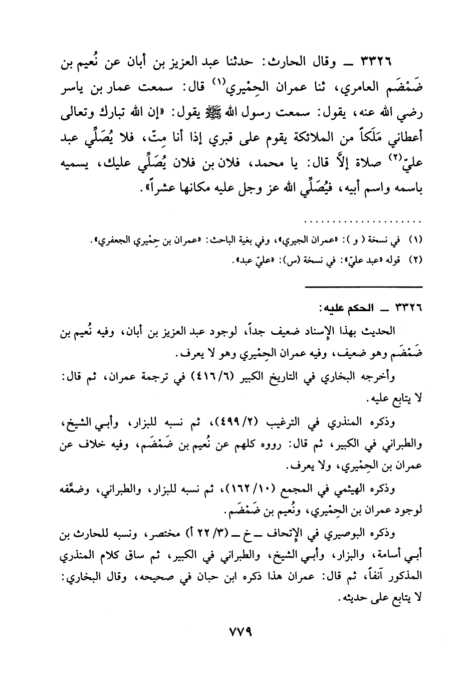 3326 - وقال الْحَارِثُ: حَدَّثَنَا عَبْدُ الْعَزِيزِ بْنُ أَبَانَ عَنْ نُعَيْمِ بْنِ ضَمْضَمٍ الْعَامِرِيِّ، ثنا عِمْرَانُ الْحِمْيَرِيُّ قَالَ: سَمِعْتُ عَمَّارَ بْنَ يَاسِرٍ رَضِيَ الله عَنْه، يَقُولُ: سَمِعْتُ رَسُولَ اللَّهِ صَلَّى اللَّهُ عَلَيْهِ وَسَلَّمَ يَقُولُ: " إِنَّ اللَّهَ تَبَارَكَ وَتَعَالَى §أَعْطَانِي مَلَكًا مِنَ الْمَلَائِكَةِ يَقُومُ عَلَى قَبْرِي إِذَا أَنَا مُتُّ، فلا يُصَلِّي عبد عَلَيَّ صَلَاةٌ إِلَّا قَالَ: يَا مُحَمَّدُ، فُلَانُ بْنُ فُلَانٍ يُصَلِّى عَلَيْكَ، يُسَمِّيهِ بِاسْمِهِ وَاسْمِ أَبِيهِ، فَيُصَلِّي اللَّهُ عَزَّ وَجَلَّ عَلَيْهِ مَكَانَهَا عَشْرًا ".