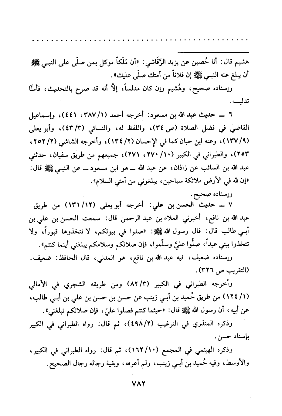 = هشيم قال: أنا حُصين عن يزيد الرَّقَاشي: "أن مَلَكًا موكل بمن صَلَّى عَلَى النَّبِيِّ -صَلَّى اللَّهُ عَلَيْهِ وَسَلَّمَ- إِنَّ يبلغ عنه النبي -صلى الله عليه وسلم- إن فلانًا من أمتك صلّى عليك".