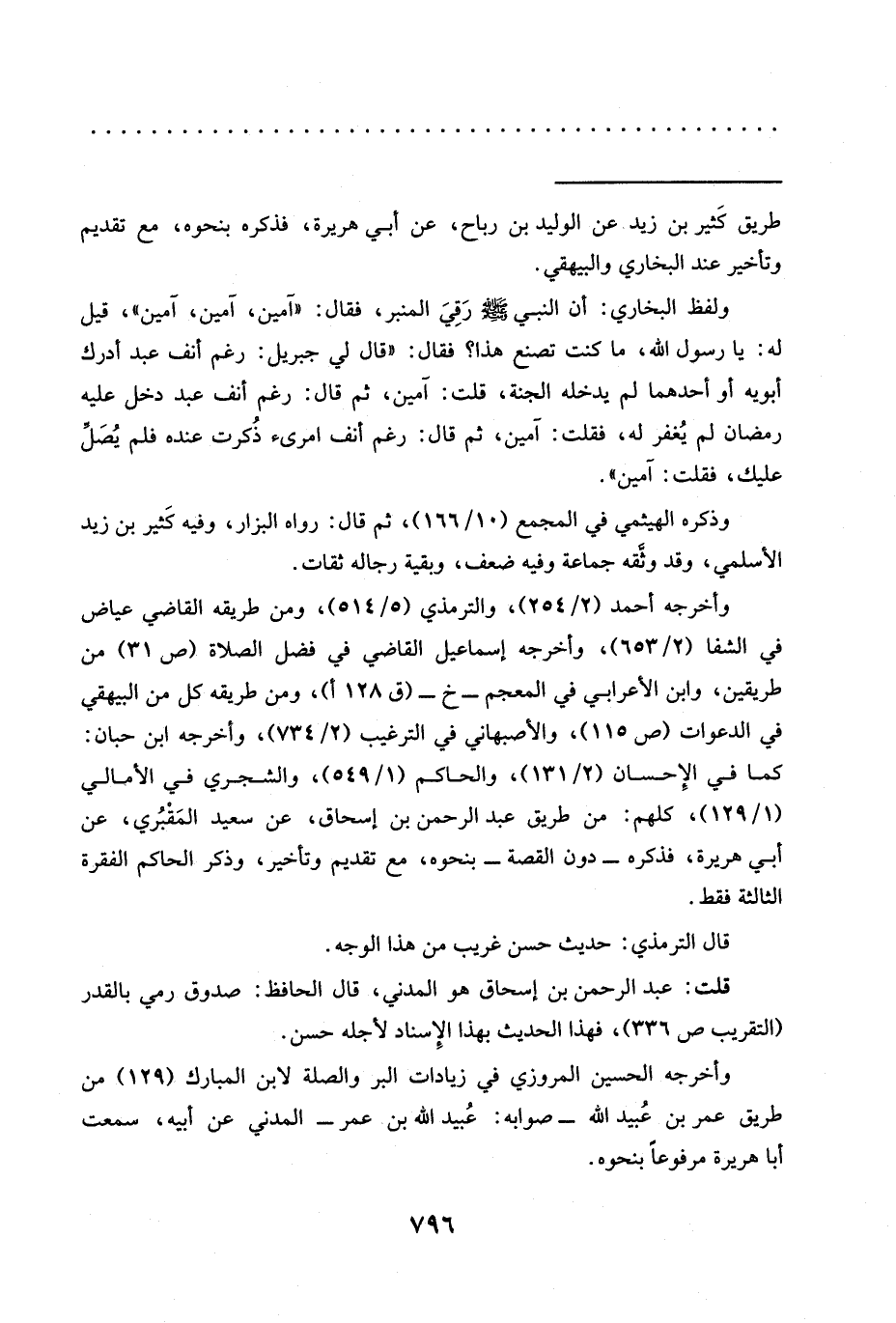 ولفظ البخاريُّ: أن النبي -صلى الله عليه وسلم- رَقِيَ المنبر، فقال: "آمين، آمين، آمين"، قيل له: يا رسول الله، ما كنت تصنع هذا؟ فقال: "قال لي جبريل: رغم أنف عبد أدرك أبويه أو أحدهما لم يدخله الجنة، قلت: آمين، ثم قال: رغم أنف عبد دخل عليه رمضان لم يُغفر له، فقلت: آمين، ثم قال: رغم أنف امرئ ذُكرت عنده فلم يُصَلِّ عليك، فقلت: آمين".