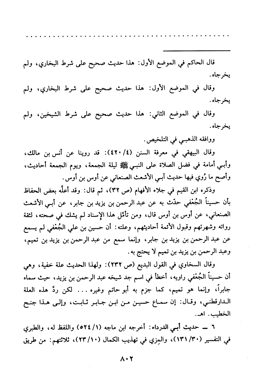 وقال السخاوي في القول البديع (ص 232): ولهذا الحديث علة خفية، وهي أن حسينًا الجُعْفي راويه، أخطأ في اسم جد شيخه عبد الرحمن بن يزيد، حيث سماه جابرًا، وإنما هو تميم، كما جزم به أبو حاتم وغيره ... لكن ردَّ هذه العلة الدارقطني، وقال: إن سماع حسين من ابن جابر ثابت، وإلى هذا جنح الخطيب. أهـ.