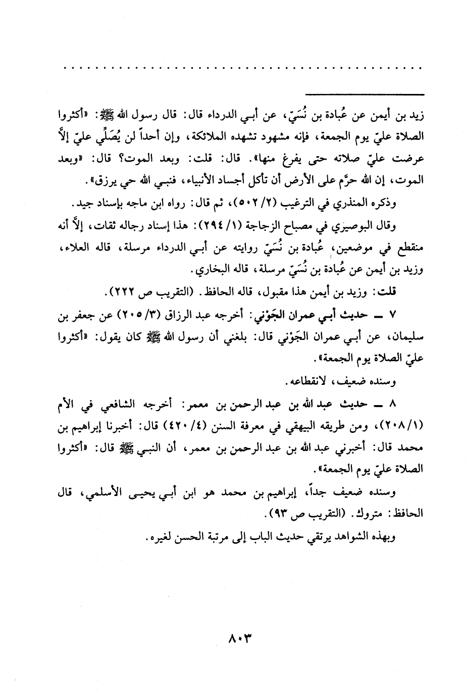 = زيد بن أيمن عن عُبادة بن نُسَيّ، عَنْ أَبِي الدَّرْدَاءِ قَالَ: قَالَ رَسُولُ اللَّهِ -صَلَّى اللَّهُ عَلَيْهِ وَسَلَّمَ-: "أَكْثِرُوا الصَّلَاةَ عَلَيَّ يوم الجمعة، فإنه مشهود تشهده الملائكة، وإن أحدًا لن يُصَلِّي عليّ إلَّا عرضت عليّ صلاته حتى يفرغ منها". قال: قلت: وبعد الموت؟ قال: "وبعد الموت، إن الله حرّم على الأرض أن تأكل أجساد الأنبياء، فنبي الله حي يرزق".