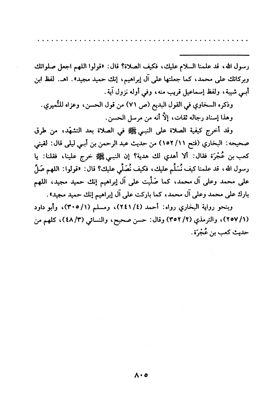 وقد أخرج كيفية الصلاة على النبي -صلى الله عليه وسلم- في الصلاة بعد التشهّد، من طرق صحيحه: البخاريُّ (فتح 11/ 152) من حديث عبد الرحمن بن أبي ليلى قال: لقيني كعب بن عُجْرَة فقال: ألا أهدي لك هدية؟ إنَّ النَّبِيَّ -صَلَّى اللَّهُ عَلَيْهِ وَسَلَّمَ- خَرَجَ علينا، فقلنا: يا رَسُولُ اللَّهِ -صَلَّى اللَّهُ عَلَيْهِ وَسَلَّمَ-، قَدْ علمنا كيف نُسَلِّم عليك، فكيف نُصَلِّي عليك؟ قال: "قولوا: اللهم صَلِّ عَلَى مُحَمَّدٍ وَعَلَى آلِ محمَّد، كَمَا صَلَّيْتَ على آل إبراهيم إنك حميد مجيد، اللهم بارك على محمَّد وعلى آل محمد، كما باركت على آل إبراهيم إنك حميد مجيد".