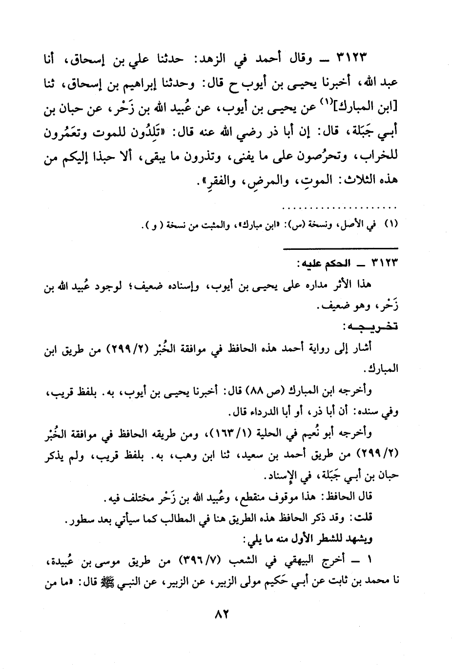 3123 - وقال أَحْمَدُ فِي الزُّهْدِ: حدثنا عَلِيُّ بْنُ إِسْحَاقَ، أنا عبد الله، أخبرنا يَحْيَى بِنُ أَيُّوبَ ح قال: وحدثنا إِبْرَاهِيمُ بْنُ إِسْحَاقَ، ثنا [ابْنُ المبارك] عَنْ يَحْيَى بْنِ أَيُّوبَ، عَنْ عُبَيْدِ اللَّهِ بْنِ زَحْرٍ، عَنْ حِبَّانَ بْنِ أَبِي جَبَلة، قال: أَنَّ أَبَا ذَرٍّ رَضِيَ الله عَنْه قَالَ: " تَلِدُونَ لِلْمَوْتِ وَتُعَمِّرُونَ لِلْخَرَابِ، وَتَحْرِصُونَ عَلَى مَا يَفْنَى، وَتَذَرُونَ مَا يَبْقَى، ألا حبذا إليكم من هذه الثَّلَاثُ: الْمَوْتُ، وَالْمَرَضُ، وَالْفَقْرُ ".