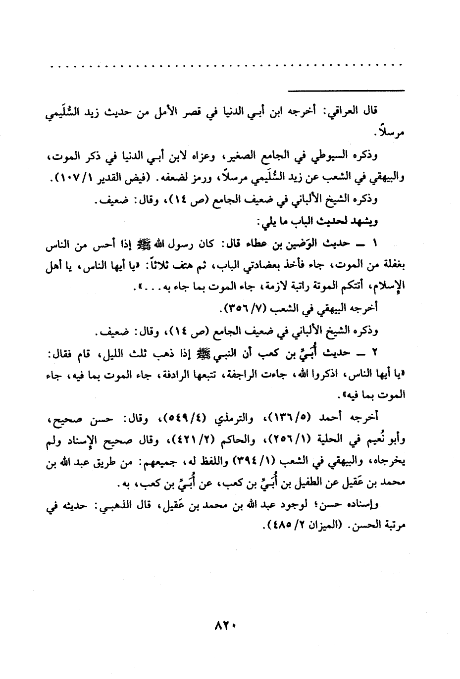 1 - حديث الوَضين بن عطاء قَالَ: كَانَ رَسُولُ اللَّهِ -صَلَّى اللَّهُ عَلَيْهِ وسلم- إذا أحس من الناس بغفلة من الموت، جاء فأخذ بعضادتي الباب، ثم هتف ثلاثًا: "يا أيها الناس، يا أهل الإِسلام، أتتكلم الموتة راتبة لازمة، جاء الموت بما جاء به ... ".
