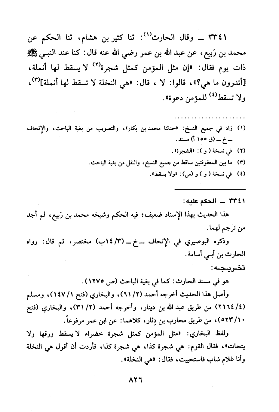 3341 - وَقَالَ الْحَارِثُ: ثنا كَثِيرُ بْنُ هِشَامٍ، ثنا الْحَكَمُ عَنْ مُحَمَّدِ بْنِ رَبِيعٍ، عَنْ عَبْدِ اللَّهِ بْنِ عُمَرَ رَضِيَ الله عَنْه قَالَ: كُنَّا عِنْدَ النَّبِيِّ صَلَّى اللَّهُ عَلَيْهِ وَسَلَّمَ ذَاتَ يَوْمٍ فَقَالَ: " إِنَّ مَثَلَ الْمُؤْمِنِ كَمَثَلِ شَجَرَةٍ لَا يَسْقُطُ لَهَا أُنْمُلَةٌ، [أَتَدْرُونَ مَا هِيَ؟ "، قَالُوا: لَا، قَالَ: " هِيَ §النخلة لا تسقط لَهَا أنملة] ، ولا تسقط لِلْمُؤْمِنِ دَعْوَةٌ ".
