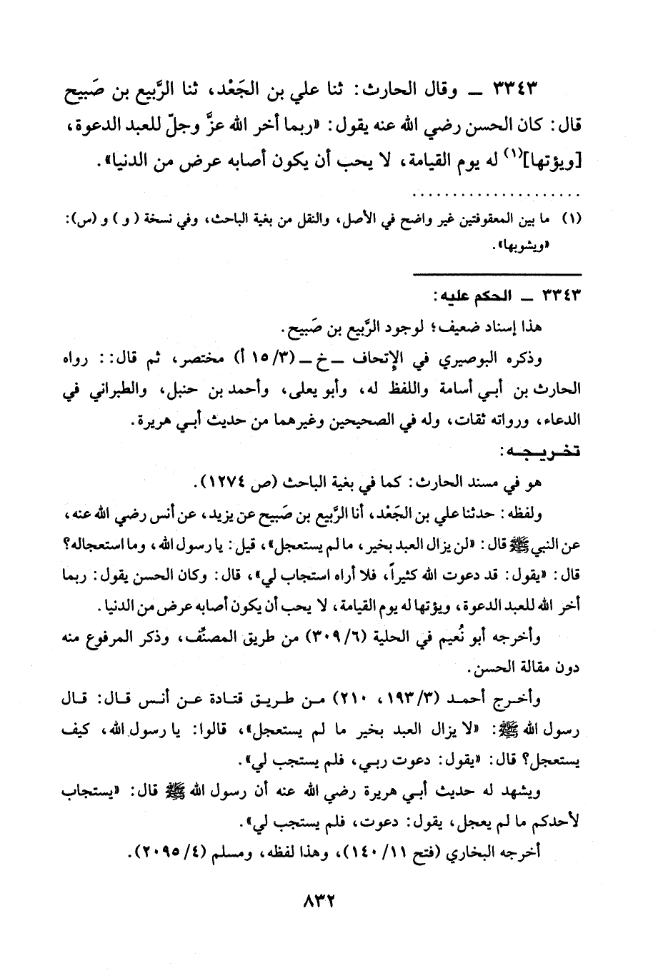 3343 - وَقَالَ الْحَارِثُ: ثنا عَلِيُّ بْنُ الْجَعْدِ، ثنا الرَّبِيعُ بْنُ صَبِيحٍ قَالَ: كَانَ الْحَسَنُ رَضِيَ الله عَنْه يَقُولُ: " §رُبَّمَا أخر الله عزَّ وجلّ لِلْعَبْدِ الدَّعْوَةَ، [ويؤتها] لَهُ يَوْمَ الْقِيَامَةِ، لَا يُحِبُّ أَنْ يَكُونَ أَصَابَهُ عَرَضٌ مِنَ الدُّنْيَا ".