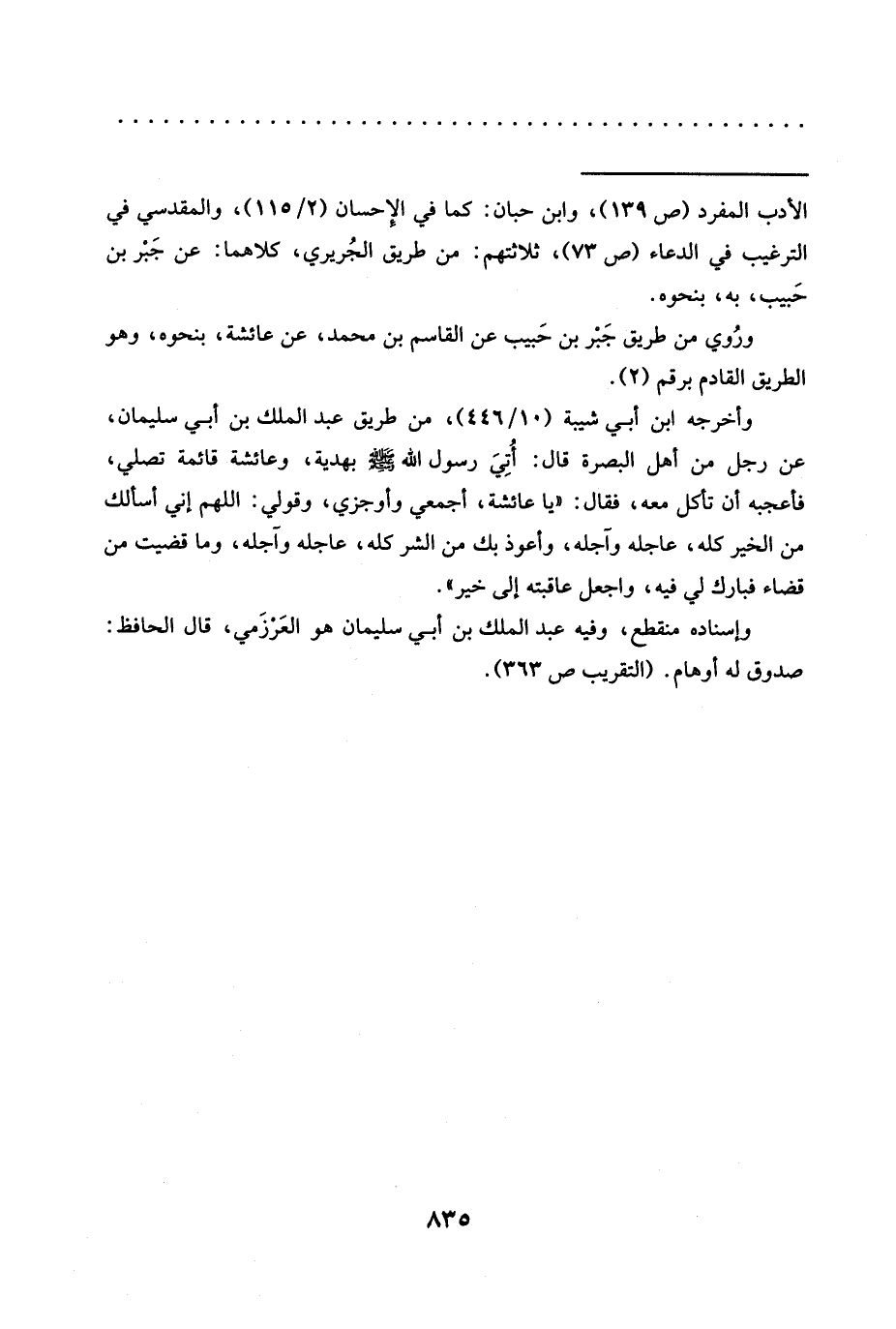 وأخرجه ابن أبي شيبة (10/ 446)، من طريق عبد الملك بن أبي سليمان، عن رجل من أهل البصرة قَالَ: أُتِيَ رَسُولَ اللَّهِ -صَلَّى اللَّهُ عَلَيْهِ وسلم- بهدية، وعائشة قائمة تصلي، فأعجبه أن تأكل معه، فقال: "يا عائشة، أجمعى وأوجزي، وقولي: اللهم إني أسألك من الخير كله، عَاجِلِهِ وَآجِلِهِ، وَأَعُوذُ بِكَ مِنَ الشَّرِّ كُلِّهِ، عاجله وآجله، وما قضيت من قضاء فبارك لي فيه، واجعل عاقبته إلى خير".