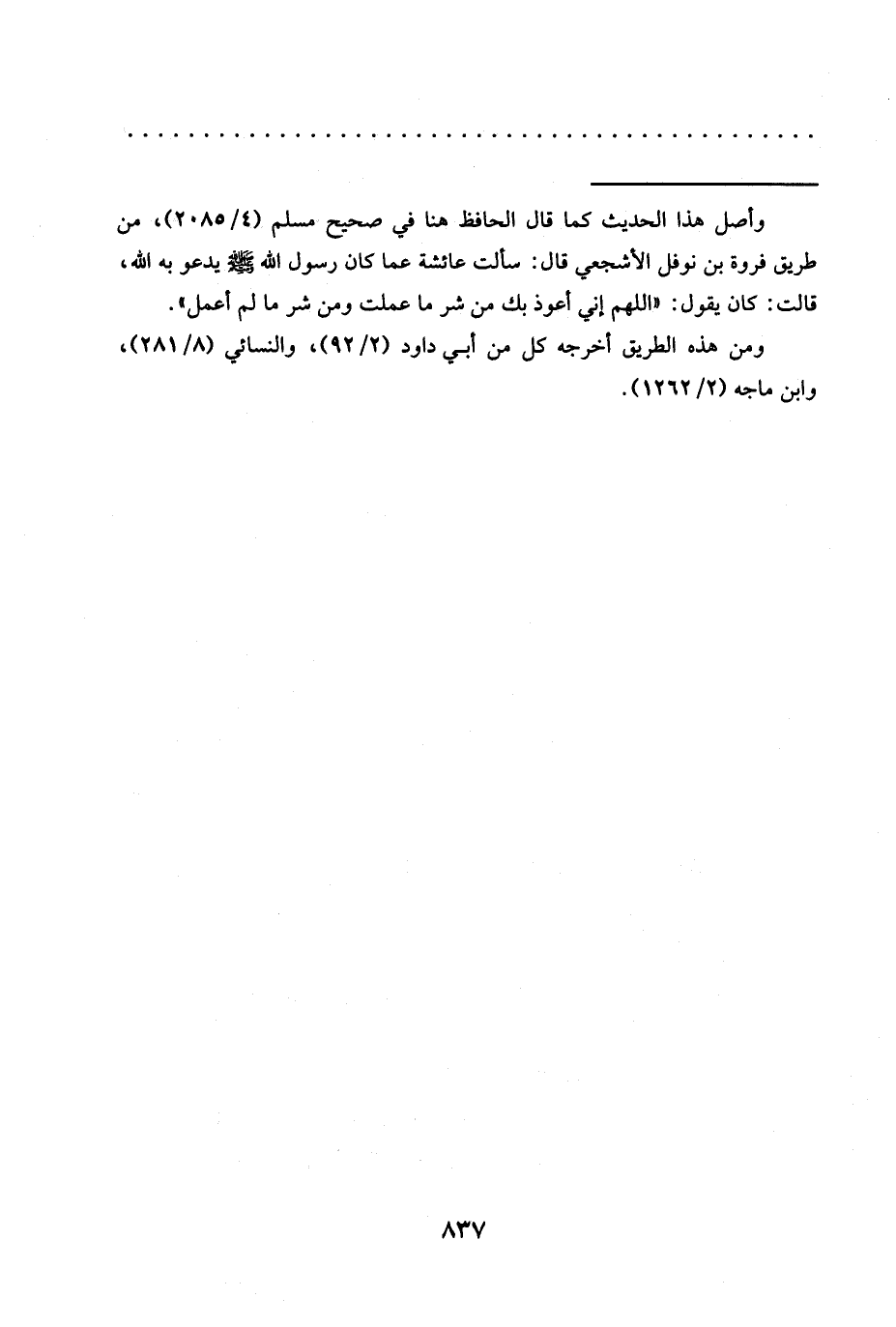 = وأصل هذا الحديث كما قال الحافظ هنا في صحيح مسلم (4/ 2085)، من طريق فروة بن نوفل الأشجعي قال: سألت عائشة عما كَانَ رَسُولُ اللَّهِ -صَلَّى اللَّهُ عَلَيْهِ وَسَلَّمَ- يدعو به الله، قالت: كَانَ يَقُولُ: "اللَّهُمَّ إِنِّي أَعُوذُ بِكَ مِنْ شر ما عملت ومن شر ما لم أعمل".