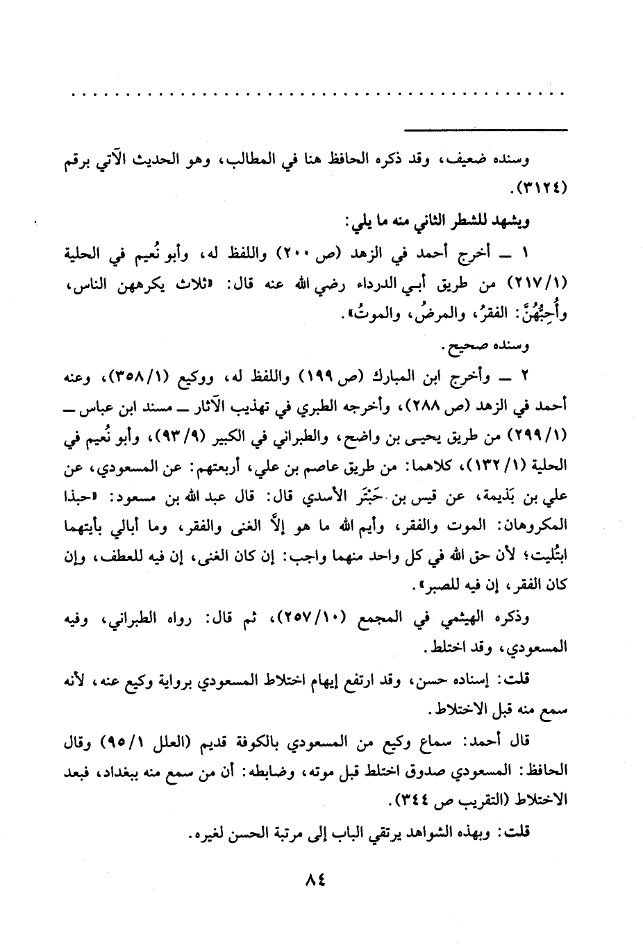 2 - وأخرج ابن المبارك (ص 199) واللفظ له، ووكيع (1/ 358)، وعنه أحمد في الزهد (ص 288)، وأخرجه الطبري في تهذيب الآثار -مسند ابن عباس- (1/ 299) من طريق يحيى بن واضح، والطبراني في الكبير (9/ 93)، وأبو نُعيم في الحلية (1/ 132)، كلاهما: من طريق عاصم بن علي، أربعتهم: عن المسعودي، عن علي بن بَذيمة، عن قيس بن. حَبْتَر الأسدي قال: قال عبد الله بن مسعود: "حبذا المكروهان: الموت والفقر، وأيم الله ما هو إلّا الغنى والفقر، وما أبالي بأيتهما ابتُليت؛ لأنّ حق الله في كل واحد منهما واجب: إن كان الغنى، إن فيه للعطف، وإن كان الفقر، ان فيه للصبر".