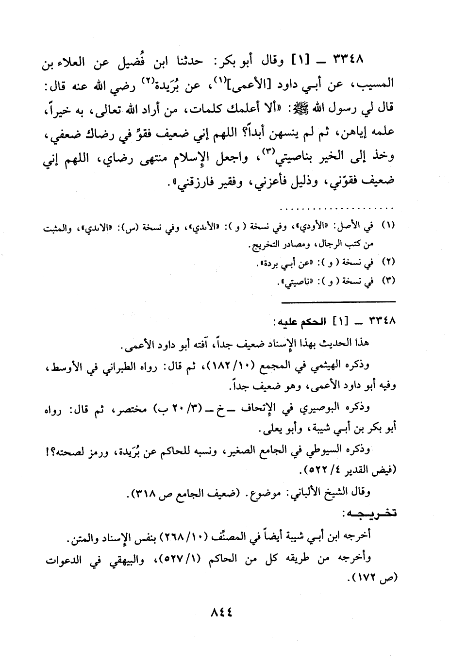 3348 -[1] وَقَالَ أَبُو بَكْرٍ: حدثنا ابْنُ فُضَيْلٍ عَنِ الْعَلَاءِ بْنِ الْمُسَيَّبِ، عَنْ أَبِي دَاوُدَ [الأعمى] ، عَنْ بُرَيْدَةَ رَضِيَ الله عَنْه قَالَ: قَالَ لِي رَسُولُ اللَّهِ صَلَّى اللَّهُ عَلَيْهِ وَسَلَّمَ: " أَلَا أُعَلِّمُكَ كَلِمَاتٍ، مَنْ أراد الله تعالى، بِهِ خَيْرًا، عَلَّمَهُ إِيَّاهُنَّ، ثُمَّ لَمْ يَنْسَهُنَّ أَبَدًا؟ §اللَّهُمَّ إِنِّي ضَعِيفٌ فَقَوِّ فِي رِضَاكَ ضَعْفِي، وَخُذْ إِلَى الْخَيْرِ بِنَاصِيَتِي، وَاجْعَلِ الْإِسْلَامَ مُنْتَهَى رِضَايَ، اللَّهُمَّ إِنِّي ضَعِيفٌ فَقَوِّنِي، وذليل فَأَعِزَّنِي، وَفَقِيرٌ فَارْزُقْنِي -[846]- ".
