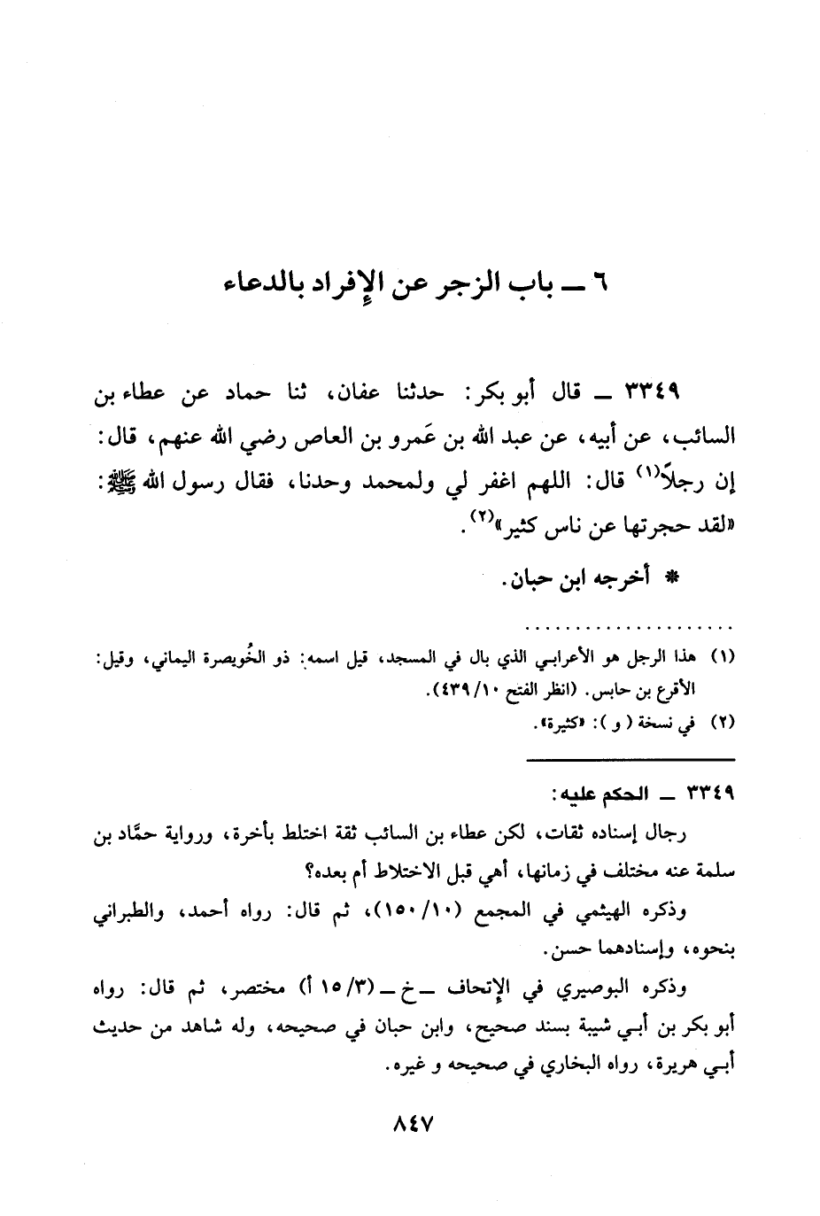 3349 - قَالَ أَبُو بَكْرِ: حدثنا عَفَّانُ، ثنا حَمَّادٌ عَنْ عَطَاءِ بْنِ السَّائِبِ، عَنْ أَبِيهِ، عَنْ عَبْدِ اللَّهِ بْنِ عَمْرِو بن العاص رَضِيَ الله عَنْهم، قَالَ: إِنَّ §رَجُلًا قَالَ: اللَّهُمَّ اغْفِرْ لِي وَلِمُحَمَّدٍ وَحْدَنَا، فَقَالَ رَسُولُ اللَّهِ صَلَّى اللَّهُ عَلَيْهِ وَسَلَّمَ: " لَقَدْ حجرتها عَنْ ناس كثير ".