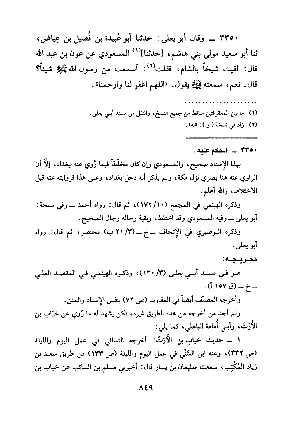 3350 - وَقَالَ أَبُو يَعْلَى: حدثنا أَبُو عُبَيْدَةَ بْنُ فُضَيْلِ بْنِ عِيَاضٍ، ثنا أَبُو سَعِيدٍ مَوْلَى بَنِي هَاشِمٍ، [حدثنا] الْمَسْعُودِيُّ عَنْ عَوْنِ بْنِ عَبْدِ اللَّهِ قَالَ: لَقِيتُ شَيْخًا بِالشَّامِ، فَقُلْتُ: أَسَمِعْتَ مِنَ رَسُولِ اللَّهِ صَلَّى اللَّهُ عَلَيْهِ وَسَلَّمَ شَيْئًا؟ قَالَ: نَعَمْ، سَمِعْتُهُ صَلَّى اللَّهُ عَلَيْهِ وَسَلَّمَ يَقُولُ: " §اللَّهُمَّ اغْفِرْ لَنَا وَارْحَمْنَا ".