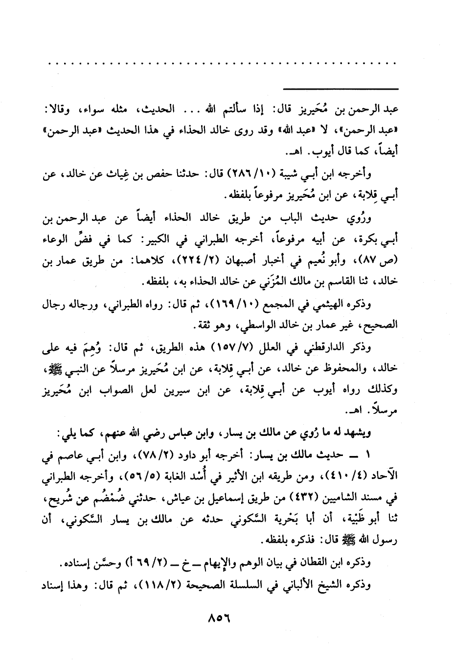 = عبد الرحمن بن مُحَيريز قال: إذا سألتم الله ... الحديث، مثله سواء، وقالا: "عبد الرحمن"، لا "عبد الله" وقد روى خالد الحذاء في هذا الحديث "عبد الرحمن" أيضًا، كما قال أيوب. أهـ.