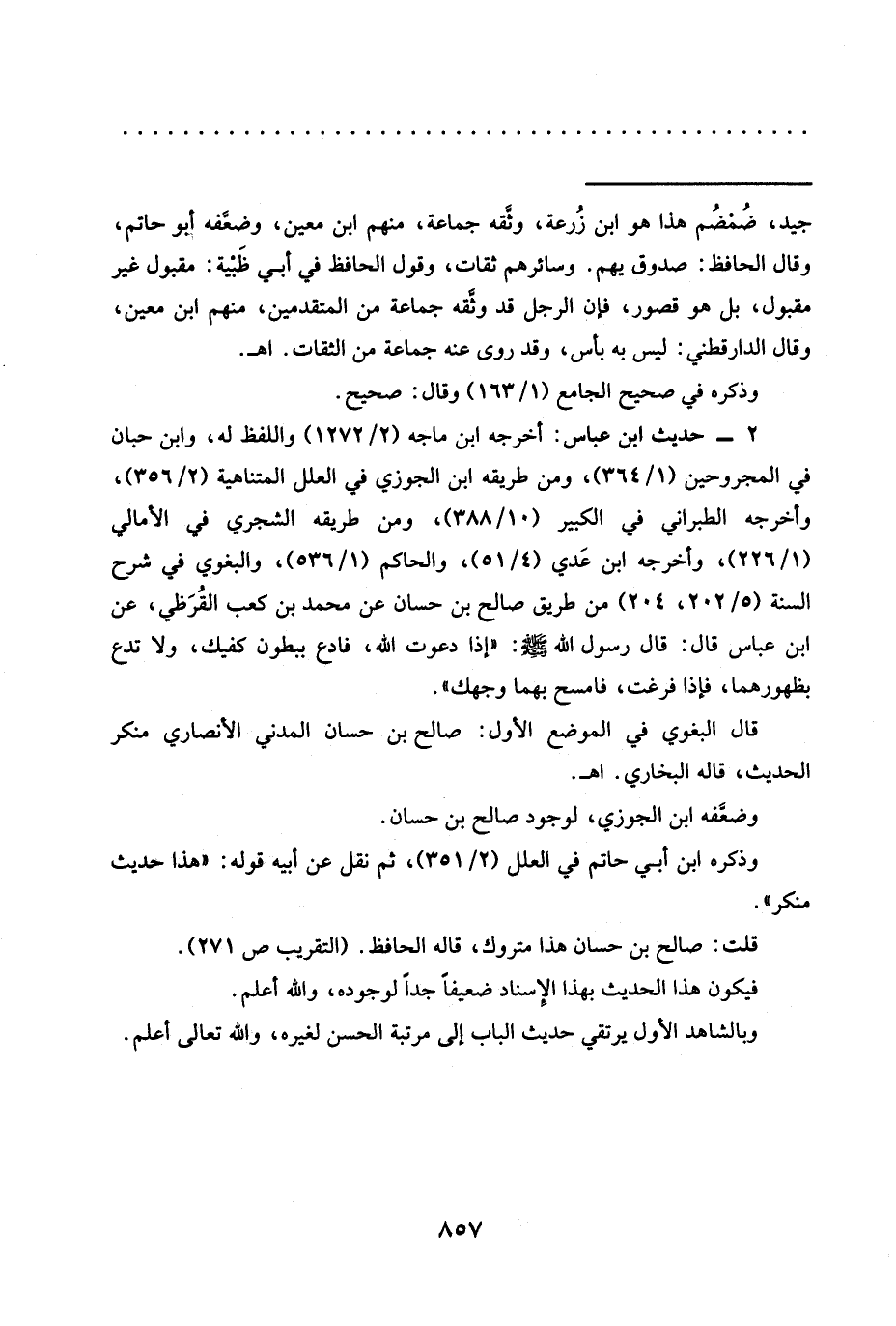 2 - حديث ابن عباس: أخرجه ابن ماجه (2/ 1272) واللفظ له، وابن حبّان في المجروحين (1/ 364)، ومن طريقه ابن الجوزي في العلل المتناهية (2/ 356)، وأخرجه الطبراني في الكبير (10/ 388)، ومن طريقه الشجري في الأمالي (1/ 226)، وأخرجه ابن عَدي (4/ 51)، والحاكم (1/ 536)، والبغويُّ في شرح السنة (5/ 202، 204) من طريق صالح بن حسان عن محمَّد بن كعب القُرَظي، عَنِ ابْنِ عَبَّاسٍ قَالَ: قَالَ رَسُولُ اللَّهِ -صلى الله عليه وسلم-: "إذا دعوت الله، فادع ببطون كفيك، ولا تدع بظهورهما، فإذا فرغت، فامسح بهما وجهك".