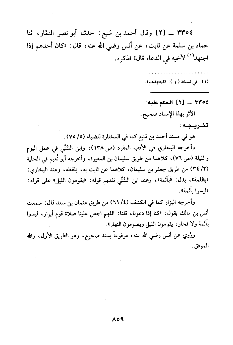 3354 - [2] وَقَالَ أَحْمَدُ بْنُ مَنيع: حَدَّثَنَا أَبُو نَصْرٍ التمَّار، ثنا حَمَّادُ بْنُ سَلَمَةَ عَنْ ثَابِتٍ، عَنْ أنس رضي الله عنه، قَالَ: "كَانَ أَحَدُهُمْ إِذَا اجْتَهَدَ (¬1) لِأَخِيهِ فِي الدعاء قال" فذكره.