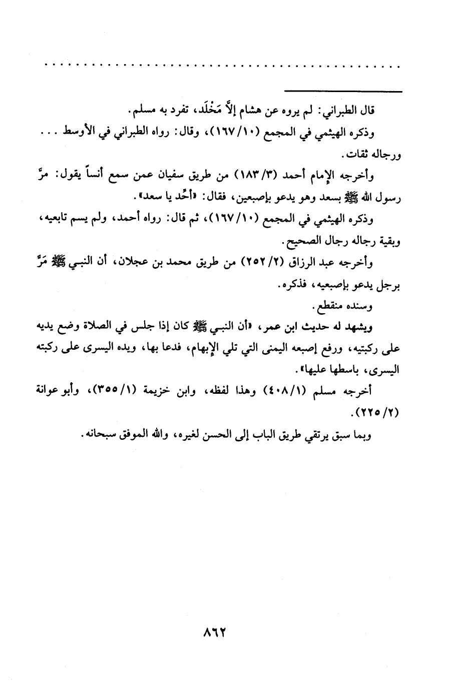 وأخرجه الإمام أحمد (3/ 183) من طريق سفيان عمن سمع أنسًا يقول: مرَّ رَسُولُ اللَّهِ -صَلَّى اللَّهُ عَلَيْهِ وَسَلَّمَ- بسعد وهو يدعو بإصبعين، فقال: "أحِّد يا سعد".