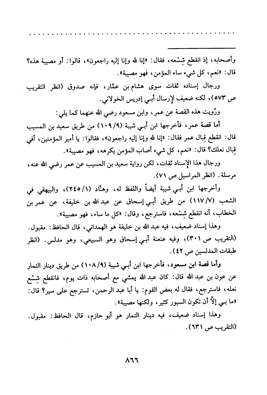 وأخرجها ابن أبي شيبة أيضًا واللفظ له، وهنَّاد (1/ 245)، والبيهقيُّ في الشعب (7/ 117) من طريق أبي إسحاق عن عبد الله بن خليفة، عن عمر بن الخطاب، أنه انقطع شِسْعه، فاسترجع، وقال: "كل ما ساء، فهو مصيبة".