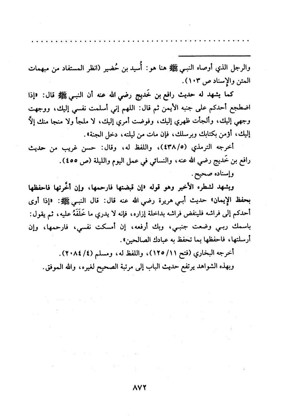 ويشهد لشطره الأخير وهو قوله "إِنْ قَبَضْتَهَا فَارْحَمْهَا، وَإِنْ أَخَّرْتَهَا فَاحْفَظْهَا بِحِفْظِ الإيمان" حديث أبي هريرة رضي الله عنه قَالَ: قَالَ النَّبِيُّ -صَلَّى اللَّهُ عَلَيْهِ وَسَلَّمَ-: "إذا أوى أحدكم إلى فراشه فلينفض فراشه بداخلة إزاره، فإنه لا يدري ما خَلَفَهُ عليه، ثم يقول: باسمك ربي وضعت جنبي، وبك أرفعه، إن أمسكت نفسي، فارحمها، وإن أرسلتها، فأحفظها بما تحفظ به عبادك الصالحين".