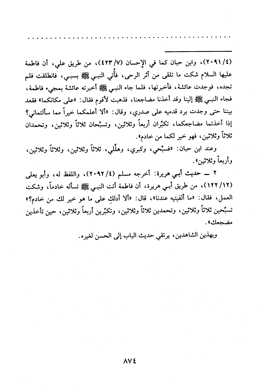 = (4/ 2091)، وابن حبّان كما في الإحسان (7/ 423)، من طريق علي، أن فاطمة عليها السلام شكت ما تلقى من أثر الرحى، فأُتي النبي -صلى الله عليه وسلم- بسبي، فانطلقت فلم تجده، فوجدت عائشة، فأخبرتها، فلما جاء النبي -صلى الله عليه وسلم- أخبرته عائشة بمجيء فاطمة، فجاء النبي -صلى الله عليه وسلم- إلينا وقد أخذنا مضاجعنا، فذهبت لأقوم فقال: "على مكانكما" فقعد بيننا حتى وجدت برد قدميه على صدري، وقال: "ألا أعلمكما خيرًا مما سألتماني؟ إذا أخذتما مضاجعكما، تكبران أربعًا وثلاثين، وتسبِّحان ثلاثًا وثلاثين، وتحمدان ثلاثًا وثلاثين، فهو خير لكما من خادم".