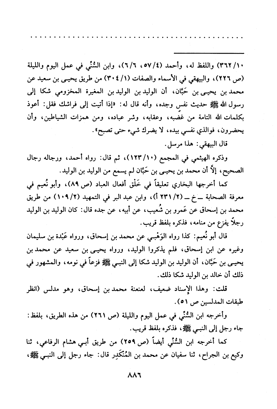 = 10/ 362) واللفظ له، وأحمد (4/ 57، 6/ 6)، وابن السُّنِّي في عمل اليوم والليلة (ص 226)، والبيهقيُّ في الأسماء والصفات (1/ 304) من طريق يَحْيَى بْنُ سَعِيدٍ عَنْ محمَّد بْنِ يَحْيَى بن حَبَّان، أن الوليد بن الوليد بن المغيرة المخزومي شكا إلى رسول الله -صلى الله عليه وسلم- حديث نفسٍ وجده، وأنه قال له: "إذا أتيت إلى فراشك فقل: أعوذ بكلمات الله التامة مِنْ غَضَبِهِ، وَعِقَابِهِ، وَشَرِّ عِبَادِهِ، وَمِنْ هَمَزَاتِ الشياطين، وأن يحضرون، فوالذي نفسي بيده، لا يضرك شيء حتى تصبح".