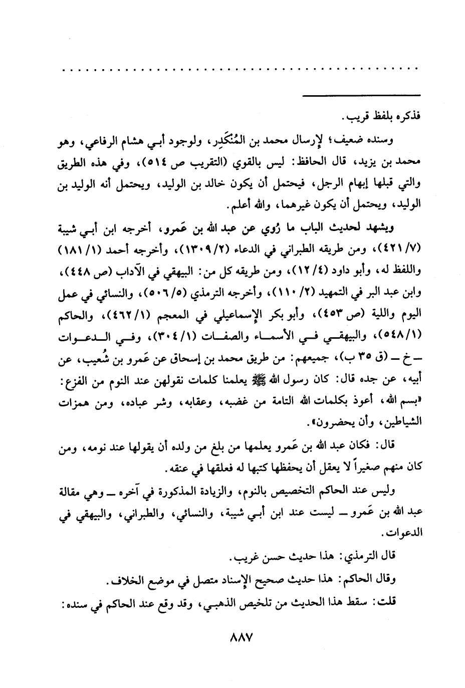 وليس عند الحاكم التخصيص بالنوم، والزيادة المذكورة في آخره -وهي مقالة عبد الله بن عَمرو- ليست عند ابن أبي شيبة، والنسائيُّ، والطبراني، والبيهقيُّ في الدعوات.