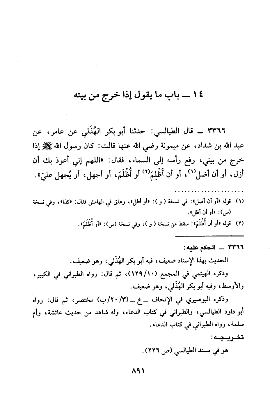 3366 - َقَالَ الطَّيَالِسِيُّ: حدثنا أَبُو بَكْرٍ الْهُذَلِيُّ عَنْ عَامِرٍ، عَنْ عَبْدِ اللَّهِ بْنِ شَدَّادٍ، عن ميمونة رَضِيَ الله عَنْها قَالَتْ: كَانَ رَسُولُ اللَّهِ صَلَّى اللَّهُ عَلَيْهِ وَسَلَّمَ §إِذَا خَرَجَ مِنْ بَيْتِي، رَفَعَ رَأْسَهُ إِلَى السَّمَاءِ، فَقَالَ: " اللَّهُمَّ إِنِّي أَعُوذُ بِكَ أَنْ أَزِلَّ، أَوْ أَنْ أضل، أو أن أَظْلِمَ أَوْ أُظْلَمَ، أَوْ أَجْهَلَ، أَوْ يُجْهَلَ عَلَيَّ ".