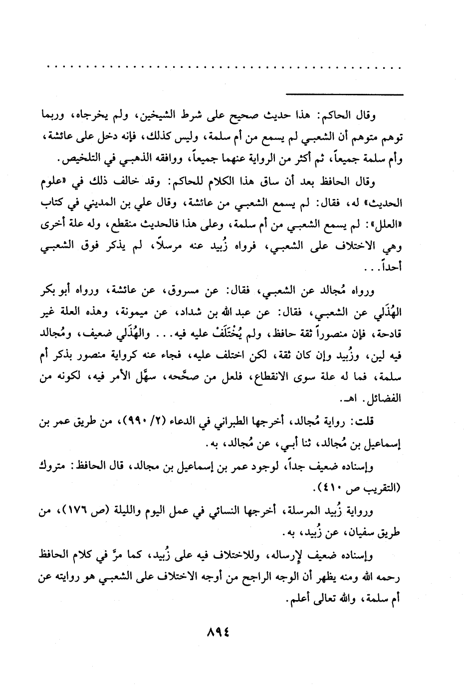 وقال الحافظ بعد أن ساق هذا الكلام للحاكم: وقد خالف ذلك في "علوم الحديث" له، فقال: لم يسمع الشعبي من عائشة، وقال علي بن المديني في كتاب "العلل": لم يسمع الشعبي من أم سلمة، وعلى هذا فالحديث منقطع، وله علة أخرى وهي الاختلاف على الشعبي، فرواه زُبيد عنه مرسلًا، لم يذكر فوق الشعبي أحدًا ...