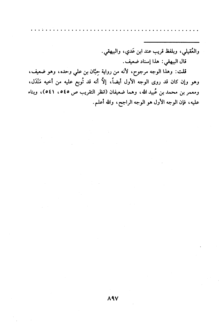 قلت: وهذا الوجه مرجوح، لأنه من رواية حِبَّان بن علي وحده، وهو ضعيف، وهو وإن كان قد روى الوجه الأوّل أيضًا، إلَّا أنه قد توبع عليه من أخيه مَنْدَل، ومعمر بن محمَّد بن عُبيد الله، وهما ضعيفان (انظر التقريب ص 545، 541)، وبناء عليه، فإن الوجه الأوّل هو الوجه الراجح، والله أعلم.