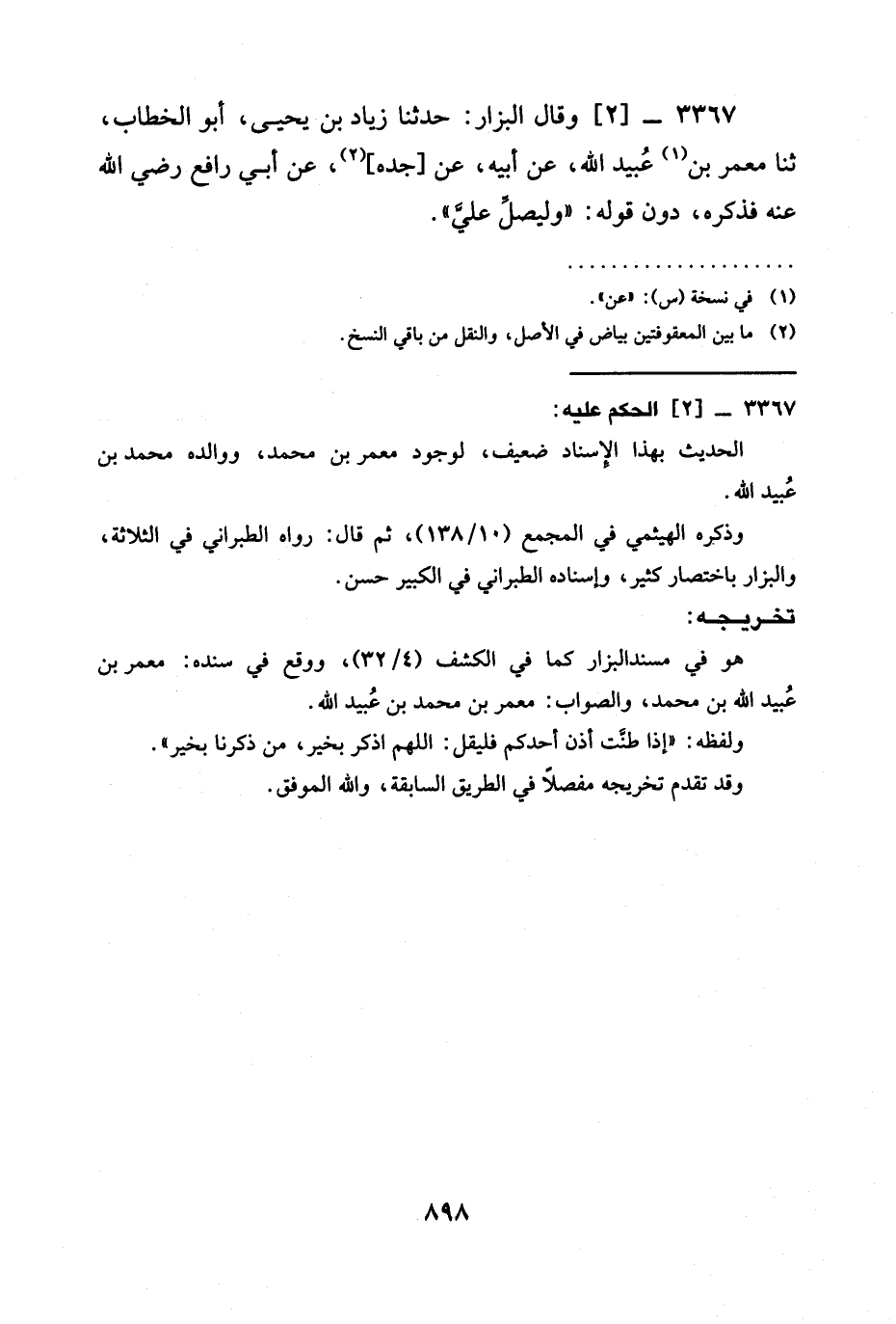 3367 - [2] وَقَالَ الْبَزَّارُ: حَدَّثَنَا زِيَادُ بْنُ يَحْيَى، أَبُو الخطاب، ثنا معمر بْنِ (¬1) عُبيد اللَّهِ، عَنْ أَبِيهِ، عَنْ [جَدِّهِ] (¬2)، عن أبي رافع رضي الله عنه فذكره، دون قوله: "وليصلِّ عليِّ".