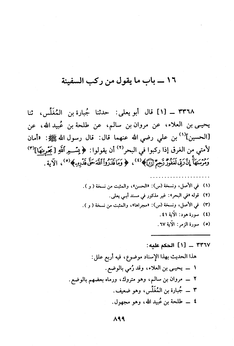 3368 -[1] قال أَبُو يَعْلَى: حدثنا جُبَارَةُ بْنُ الْمُغَلِّسِ، ثنا يَحْيَى بْنُ الْعَلَاءِ، عَنْ مَرْوَانَ بْنِ سَالِمٍ، عَنْ طَلْحَةَ بْنِ عُبَيْدِ اللَّهِ، عَنِ [الْحُسَيْنِ] بن علي رَضِيَ الله عَنْهما قَالَ: قَالَ رَسُولُ اللَّهِ صَلَّى اللَّهُ عَلَيْهِ وَسَلَّمَ: " §أَمَانٌ لِأُمَّتِي مِنَ الْغَرَقِ إذا ركبوا في الْبَحْرَ أن يقولوا: {بِسْمِ اللَّهِ [مَجْرِهاَ] وَمُرْسَهَا إِنَّ رَبِّي لَغَفُورٌ رَحِيمٌ (41) } ، {وَمَا قَدَرُوا اللَّهَ حَقَّ قَدْرِهِ} ، الْآيَةَ -[902]-.