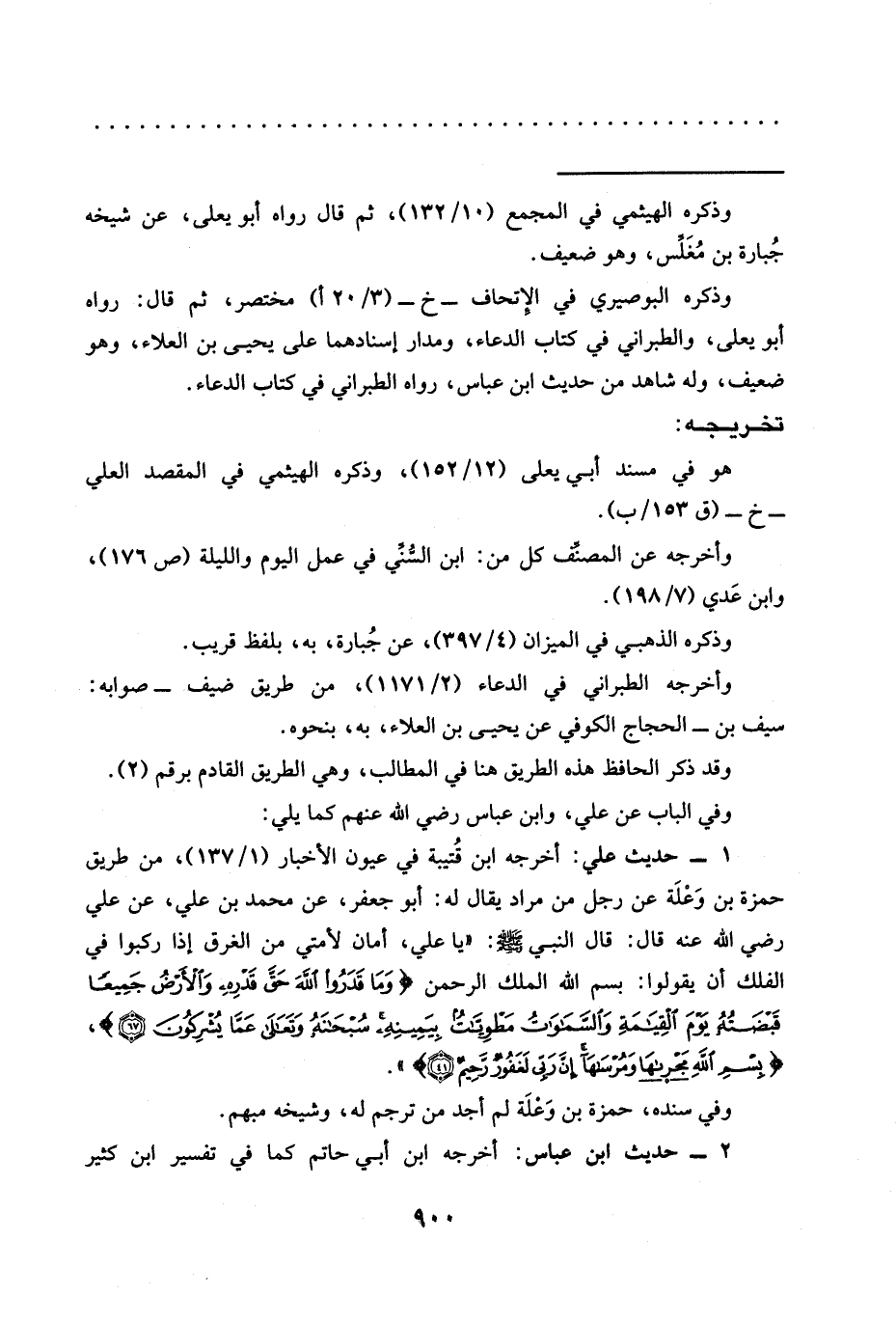 1 - حديث علي: أخرجه ابن قُتيبة في عيون الأخبار (1/ 137)، من طريق حمزة بن وَعْلَة عن رجل من مراد يقال له: أبو جعفر، عَنْ محمَّد بْنِ عَلِيٍّ، عَنْ عَلِيٍّ رَضِيَ اللَّهُ عَنْهُ قَالَ: قَالَ النَّبِيُّ -صَلَّى اللَّهُ عَلَيْهِ وَسَلَّمَ-: "يا علي، أمان لأمتي من الغرق إذا ركبوا في الفلك أن يقولوا: بسم الله الملك الرحمن {وَمَا قَدَرُوا اللَّهَ حَقَّ قَدْرِهِ وَالْأَرْضُ جَمِيعًا قَبْضَتُهُ يَوْمَ الْقِيَامَةِ وَالسَّمَاوَاتُ مَطْوِيَّاتٌ بِيَمِينِهِ سُبْحَانَهُ وَتَعَالَى عَمَّا يُشْرِكُونَ (67)}، {بِسْمِ اللَّهِ مَجْرَاهَا وَمُرْسَاهَا إِنَّ رَبِّي لَغَفُورٌ رَحِيمٌ (41)}.