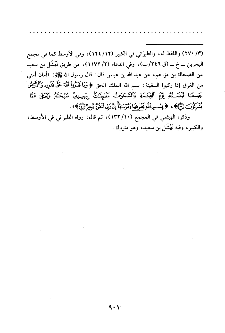 = (3/ 270) واللفظ له، والطبراني في الكبير (12/ 124)، وفي الأوسط كما في مجمع البحرين -خ- (ق 246/ ب)، وفي الدعاء (2/ 1172)، من طريق نَهْشَل بْنِ سَعِيدٍ عَنِ الضَّحَّاكِ بْنِ مُزَاحِمٍ، عن عبد الله بن عَبَّاسٍ قَالَ: قَالَ رَسُولُ اللَّهِ -صَلَّى اللَّهُ عليه وسلم-: "أمان أمتي من الغرق إذا ركبوا السفينة: بسم الله الملك الحق {وَمَا قَدَرُوا اللَّهَ حَقَّ قَدْرِهِ وَالْأَرْضُ جَمِيعًا قَبْضَتُهُ يَوْمَ الْقِيَامَةِ وَالسَّمَاوَاتُ مَطْوِيَّاتٌ بِيَمِينِهِ سُبْحَانَهُ وَتَعَالَى عَمَّا يُشْرِكُونَ (67)}، {بِسْمِ اللَّهِ مَجْرَاهَا وَمُرْسَاهَا إِنَّ رَبِّي لَغَفُورٌ رَحِيمٌ (41)} ".