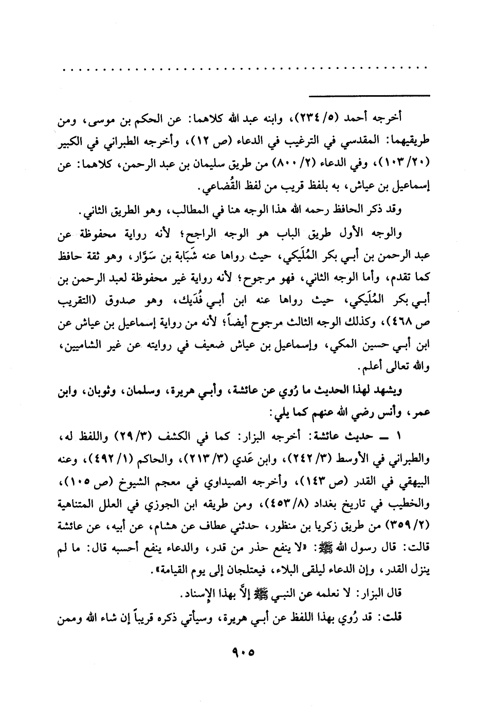 1 - حديث عائشة: أخرجه البزّار: كما في الكشف (3/ 29) واللفظ له، والطبراني في الأوسط (3/ 242)، وابن عَدي (3/ 213)، والحاكم (1/ 492)، وعنه البيهقي في القدر (ص 143)، وأخرجه الصيداوي في معجم الشيوخ (ص 105)، والخطيب في تاريخ بغداد (8/ 453)، ومن طريقه ابن الجوزي في العلل المتناهية (2/ 359) من طريق زكريا بن منظور، حدثني عطاف عن هشام، عن أبيه، عَنْ عَائِشَةَ قَالَتْ: قَالَ رَسُولُ اللَّهِ -صَلَّى الله عليه وسلم-: "لا ينفع حذر من قدر، والدعاء ينفع أحسبه قال: ما لم ينزل القدر، وإن الدعاء ليلقى البلاء، فيعتلجان إلى يوم القيامة".